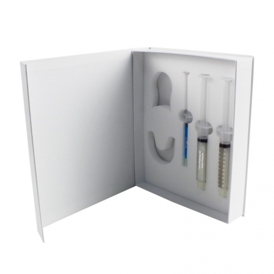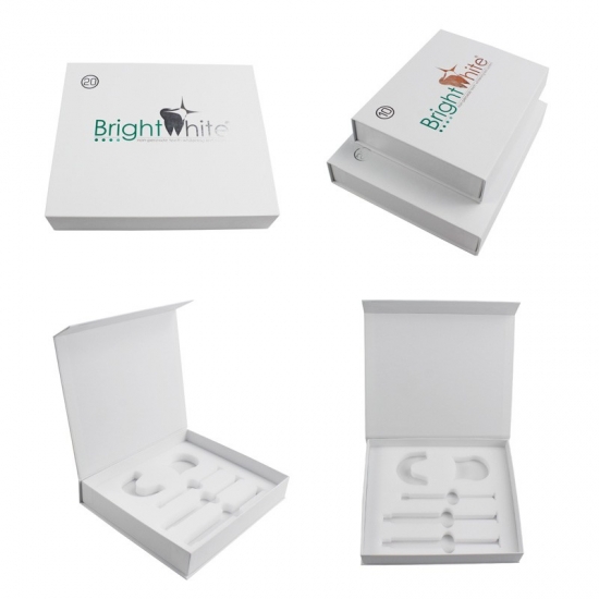 This is a antique book shaped magnetic box which made by C2S art paper + 2mm grey board,outside of box and inside of box in white,the logo on the lid is foil stamping and EVA inside can be custom shape as per your request.