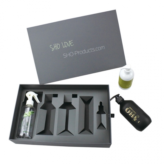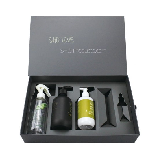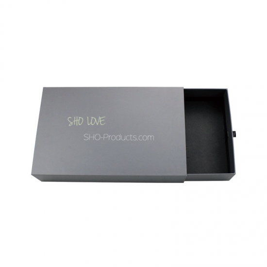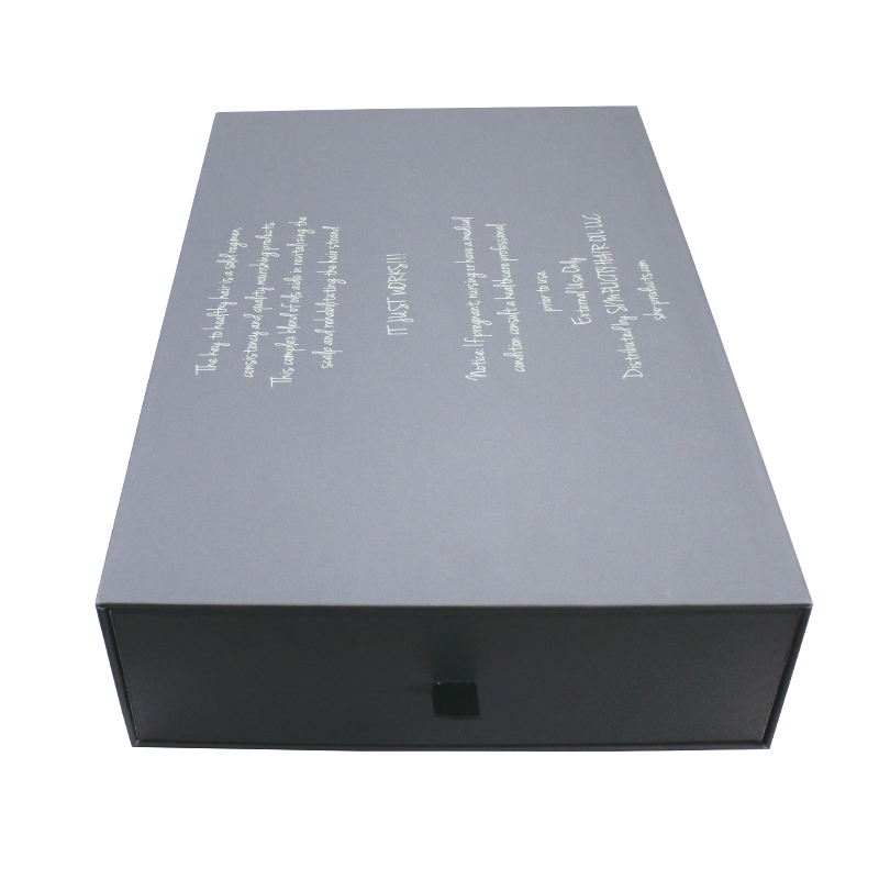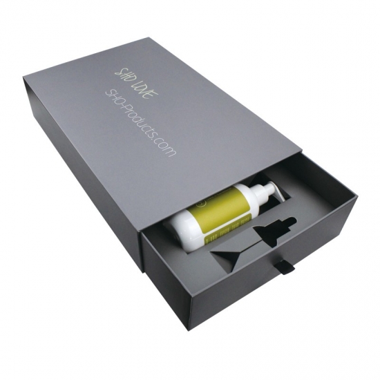 It's a matte grey color beauty skincare sliding drawer box which made by 157g C2S art paper + 1200g grey board,full of grey printing on box with bespoke logo and text,matte surface finishing make it looks high-end and classy.