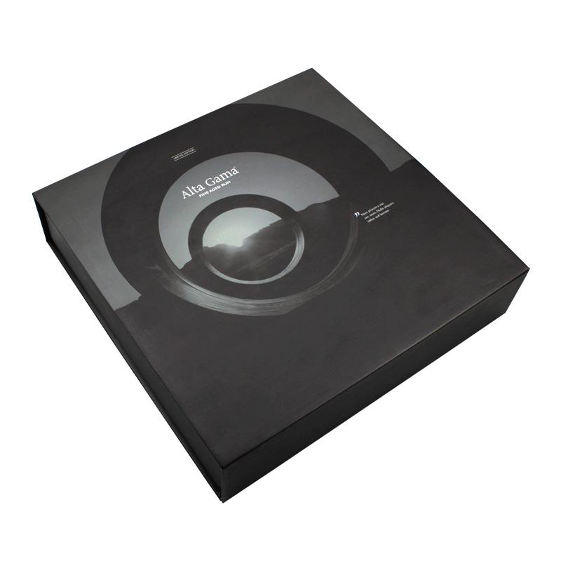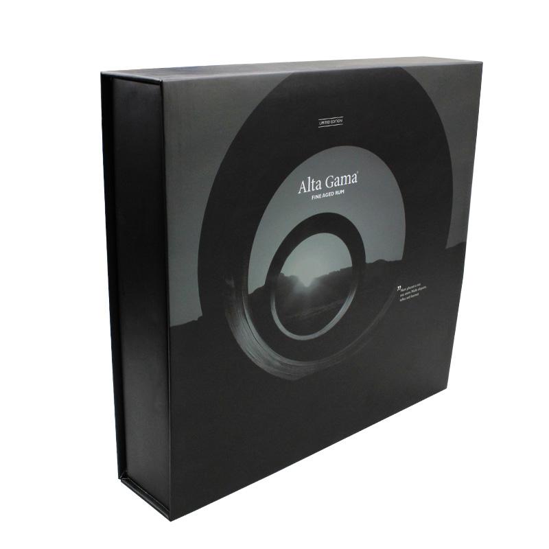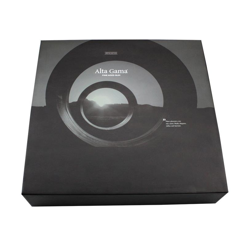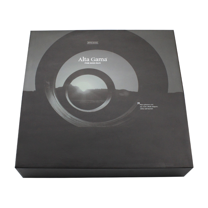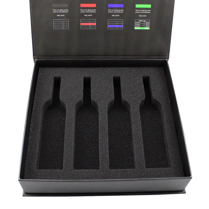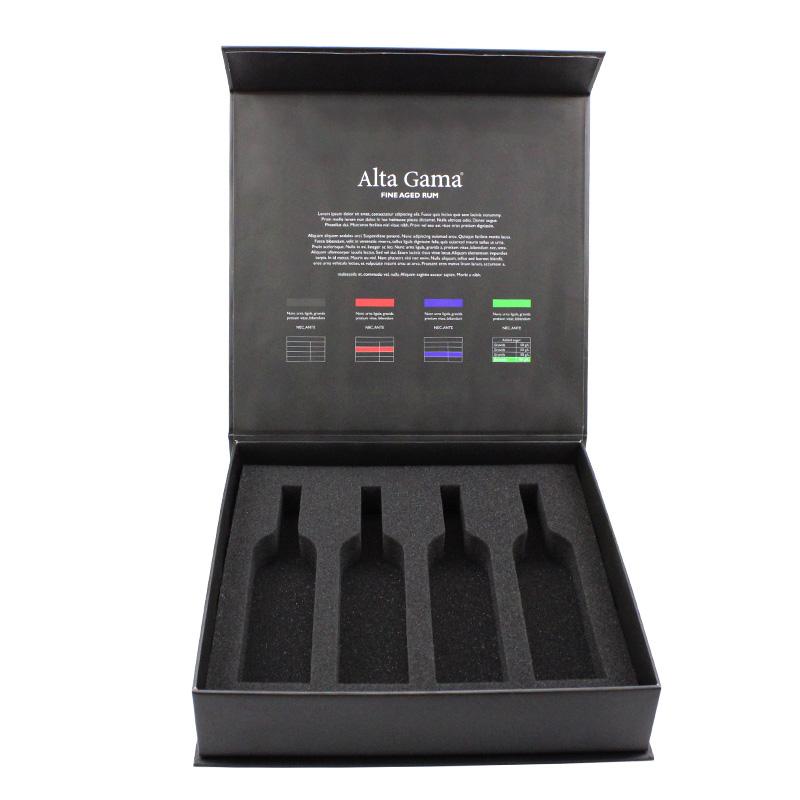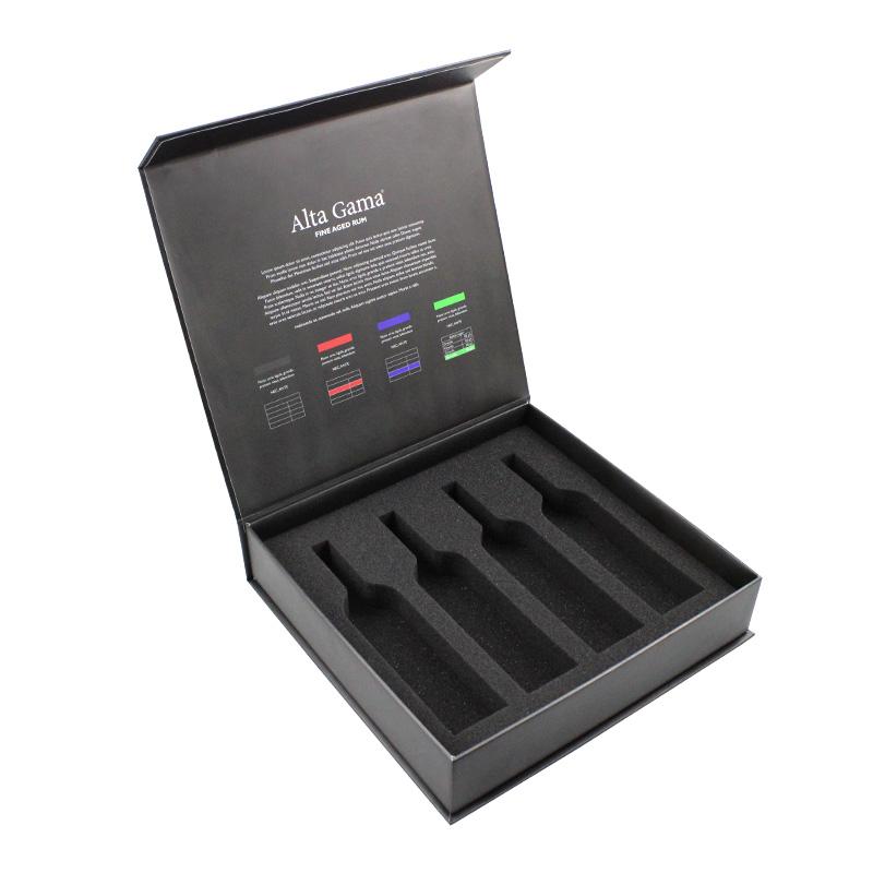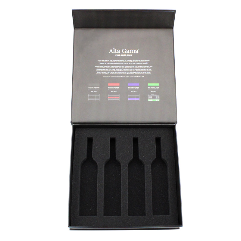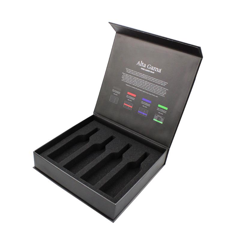 This is a black packaging bottles magnetic box which made by 157g C2S art paper + 2mm grey board,outside of box is spot UV-coating on specific logo that make the box look glossy and luxury,inside of box insert custom shape black sponge padding.