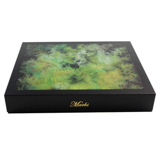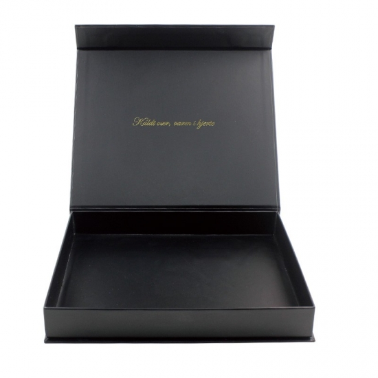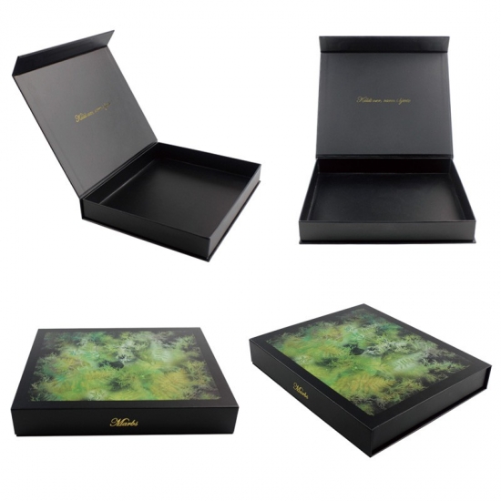 This is a customized black gift box with magnetic closure which made by 157g C2S art paper + 1200g grey board,it's a decorative matt black box that outside of box is full color printing and logo inside of box is gold foil stamping.