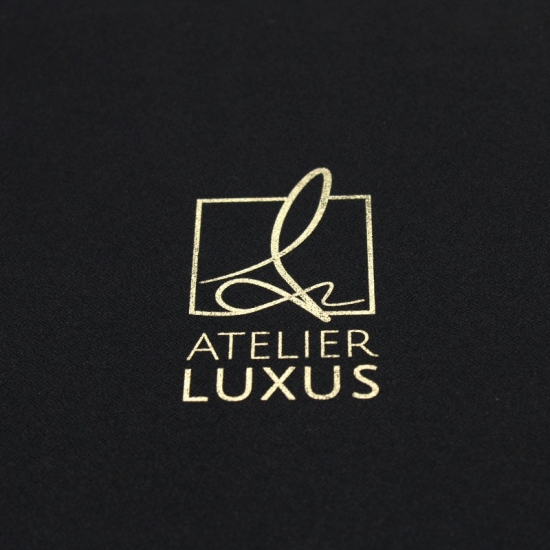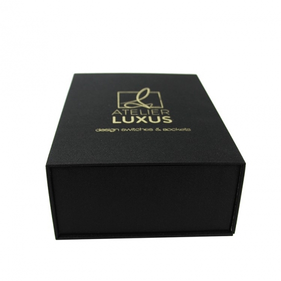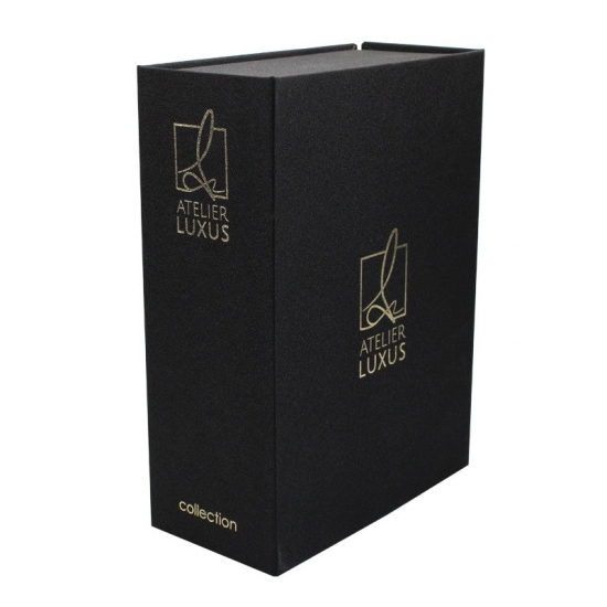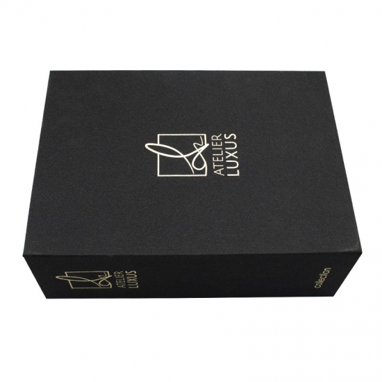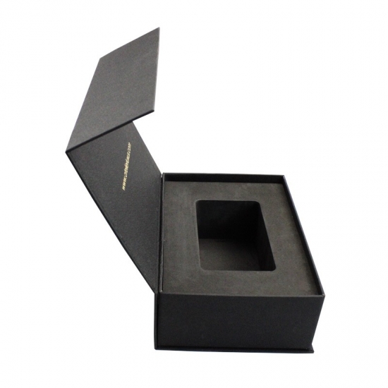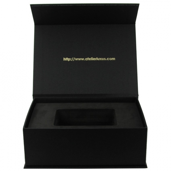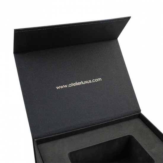 This is a black magnetic flap box with EVA foam padding which made byfabric pattern specialty paper+ 1200g grey board,and the logo inside and ouside are gold foil stamping.