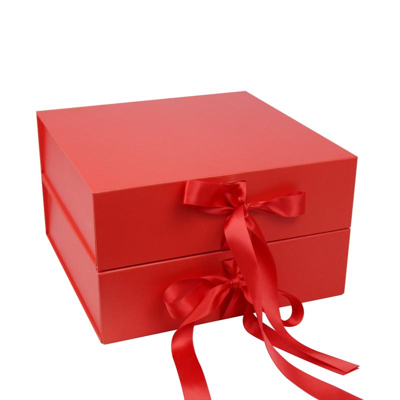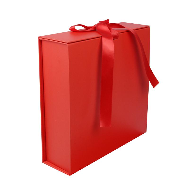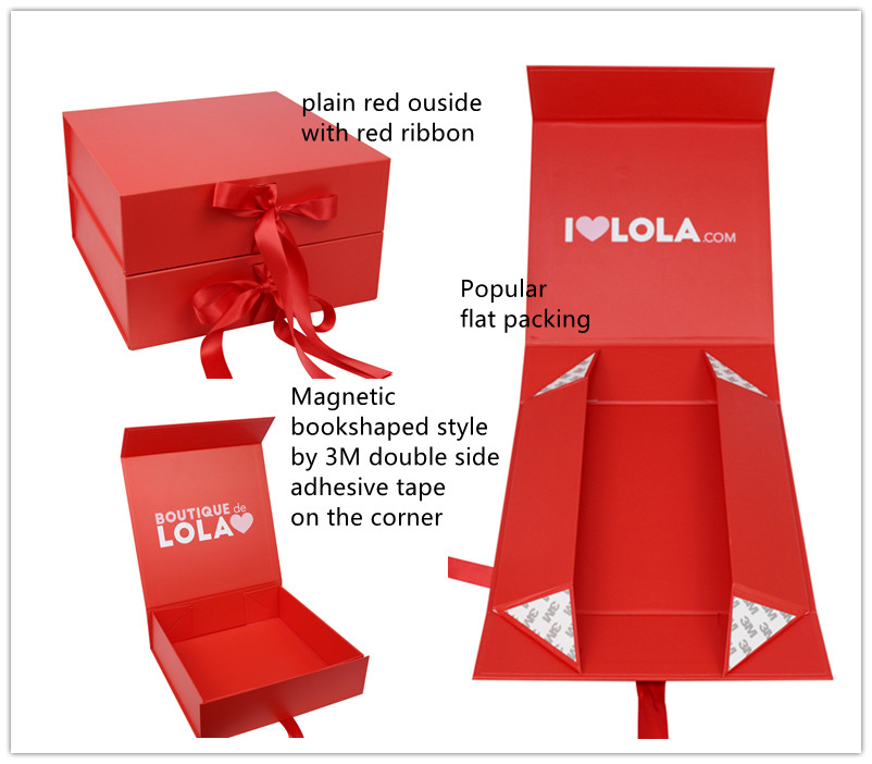 Classical Ribbon Tie Box, made of C2S art paper mounted with 1200gsm rigid cardboard, with magnet and ribbon closure. Plain red surface outside. custom logo inside lid, ,makes you wonder what product inside. 3M stickers used on the corner, you can use it like a standard magnetic bookshaped boxes.