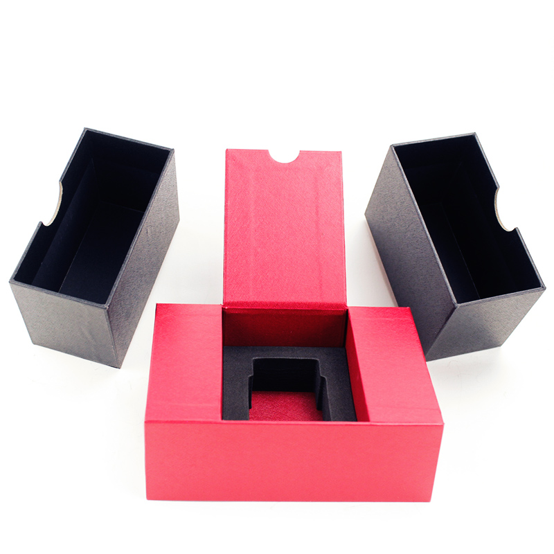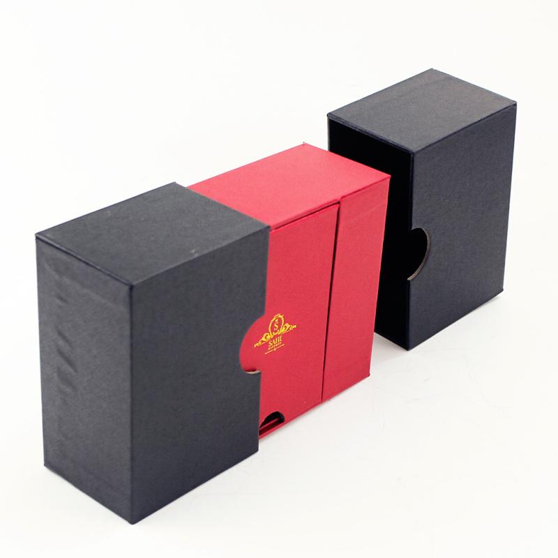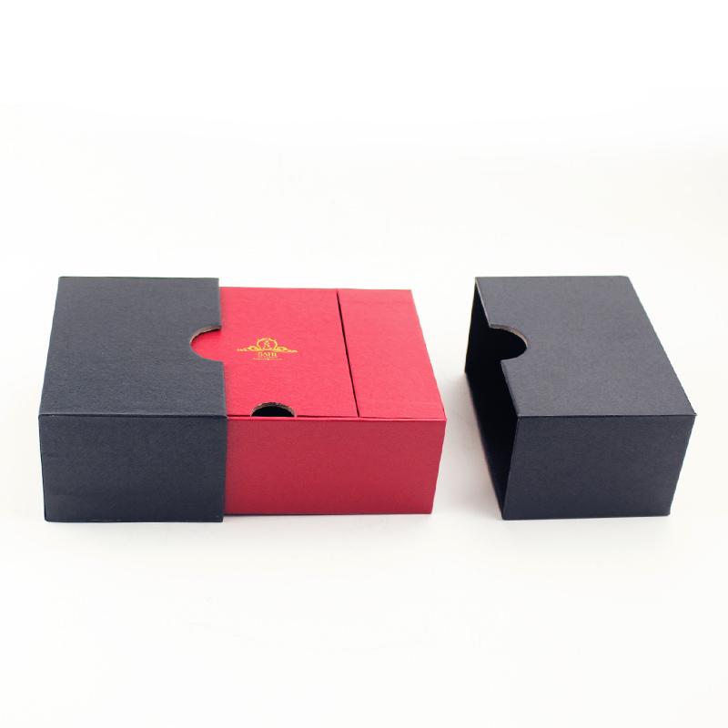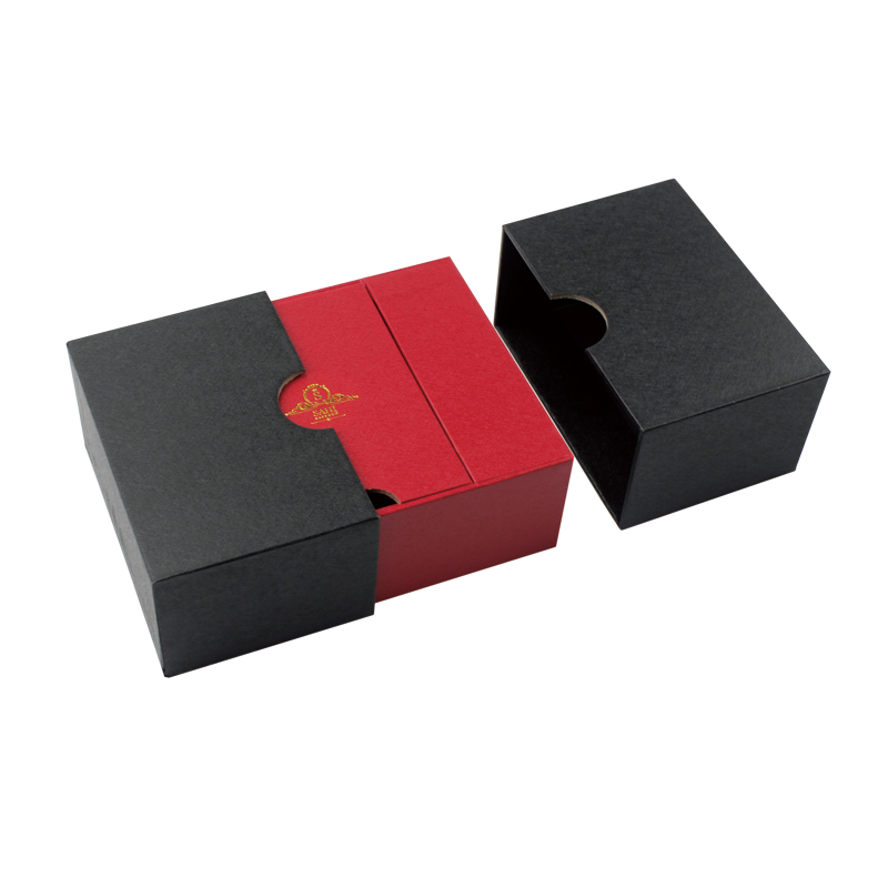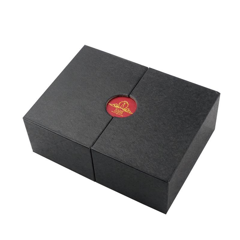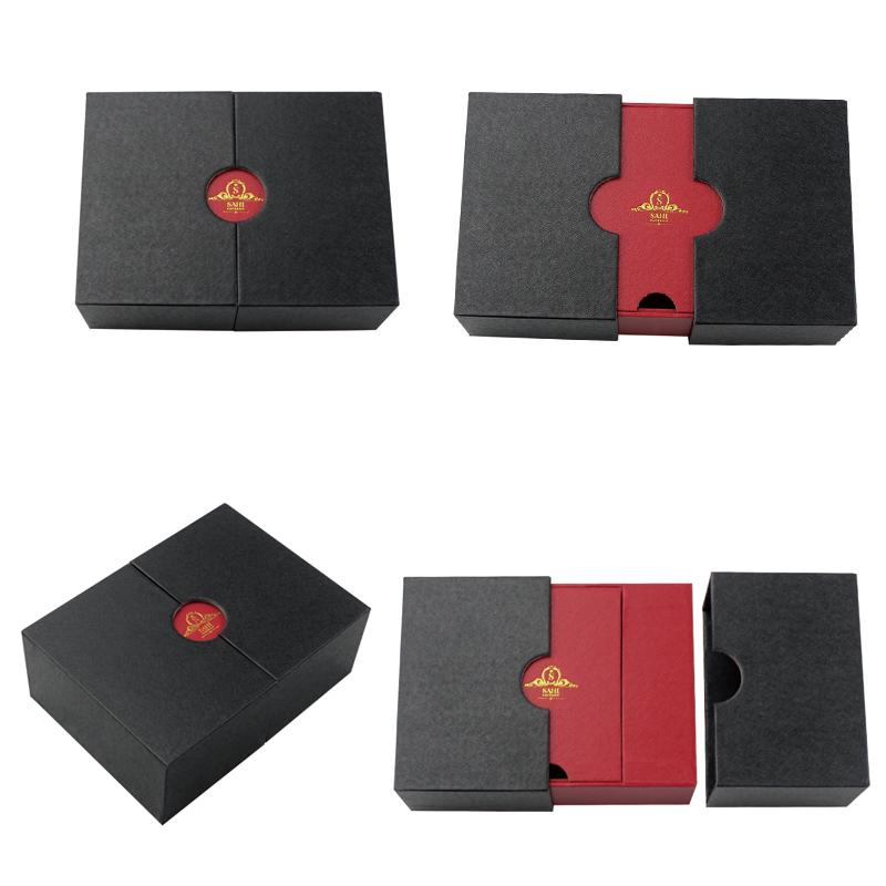 This is a special unique design box which made by special texture paper,outside of cover in classic black and match chinese red inside box,the logo on the flap lid in gold foil stamped which make the box more high-end.