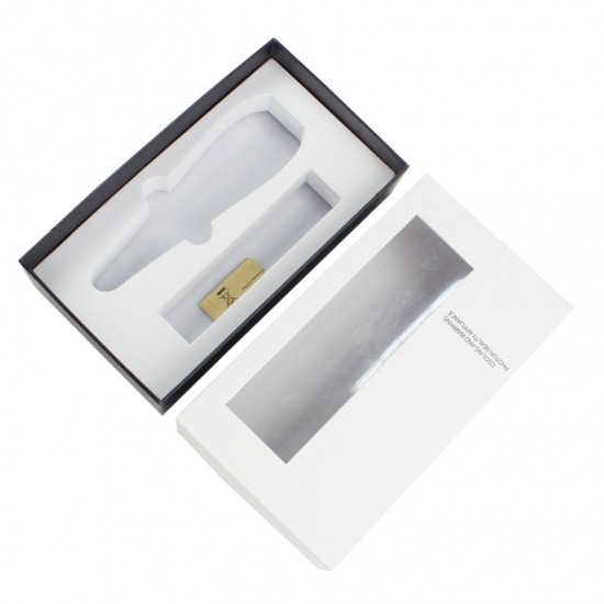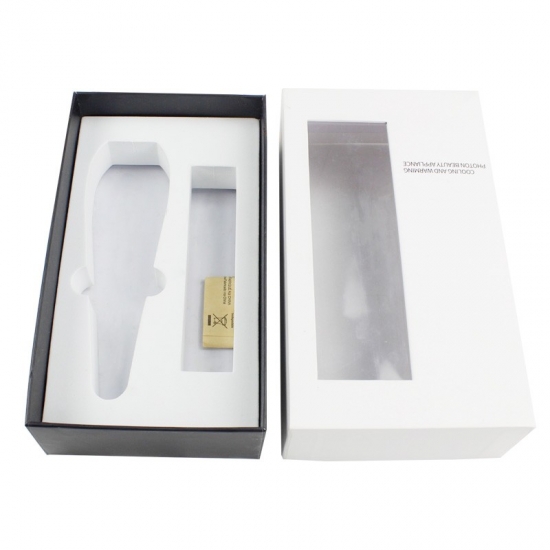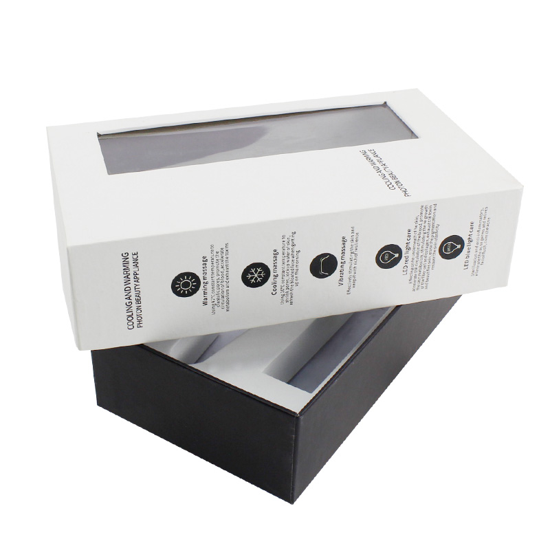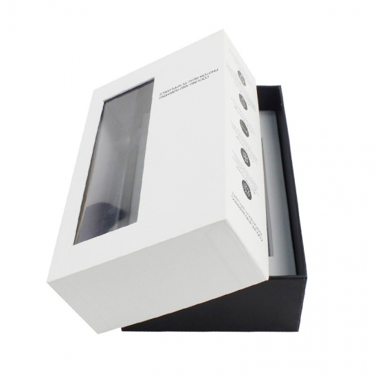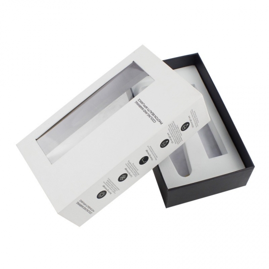 This is a gift boxes clear top which made by 157g C2S art paper + 1200g grey board,white lid with clear window and black base with custom text on the box,white EVA foam inside of the box is shaped accoding the products.