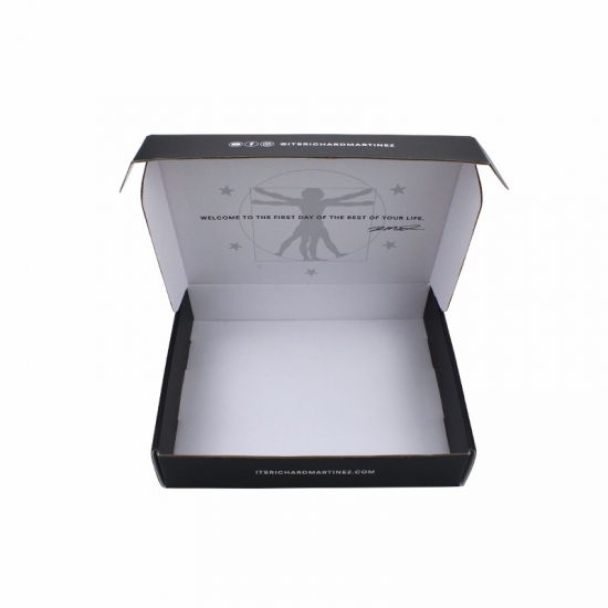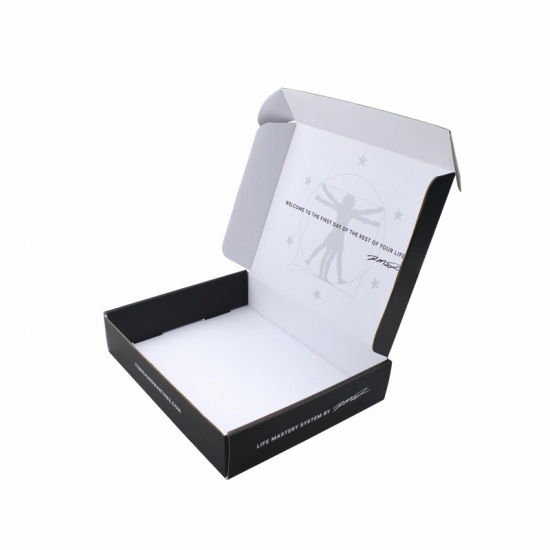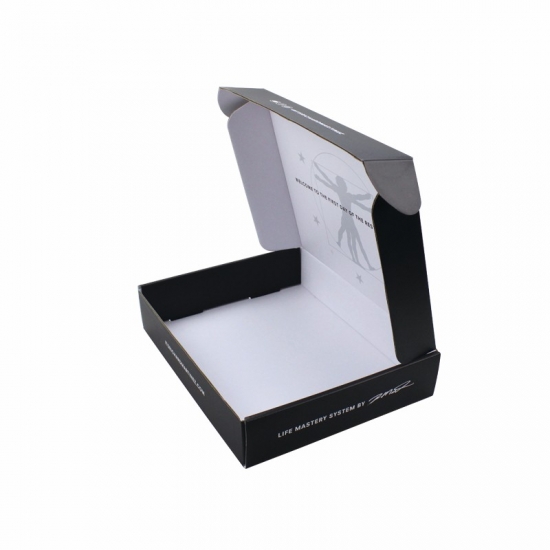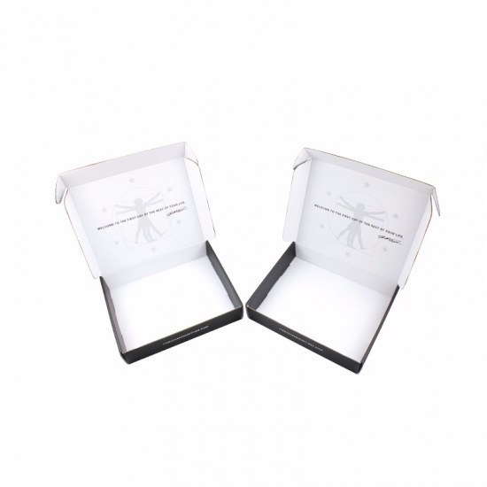 This is a black mailer packaging boxes which made by 250g CCNB+BE flute+250g CCNB,it's a easy and simple postal box than outside in black color with custom logo , inside of box custom pattern in white color.