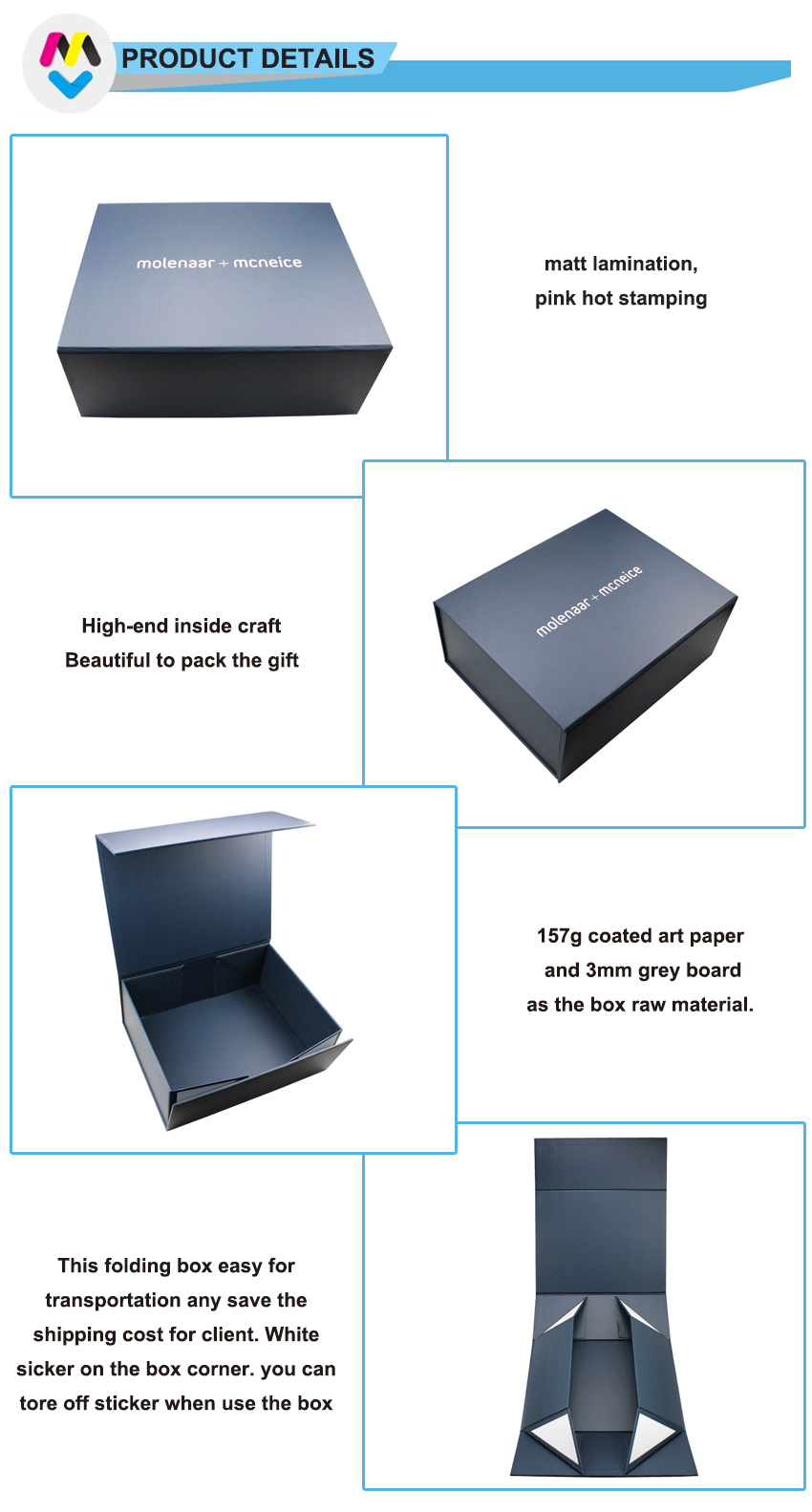 2) Material:157g coated art paper+2mm grey board
