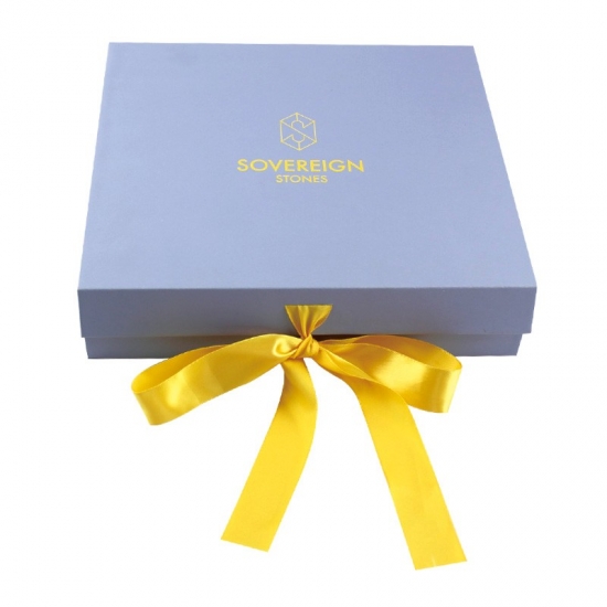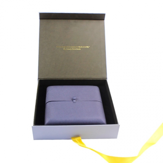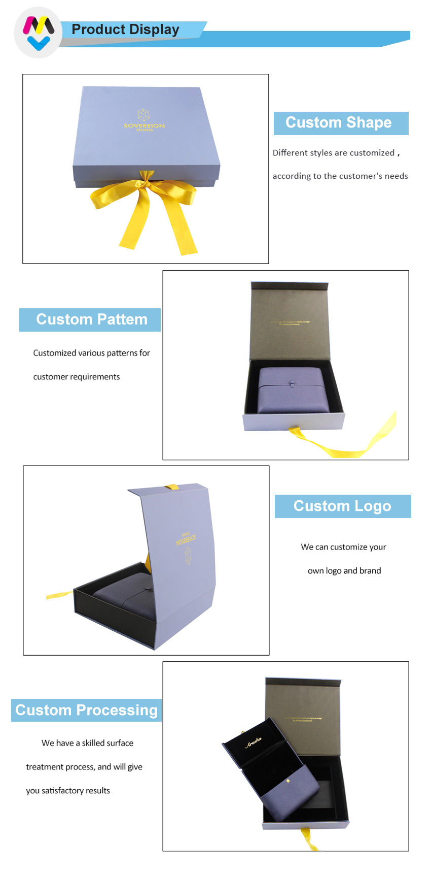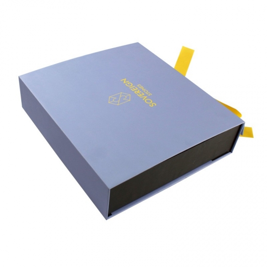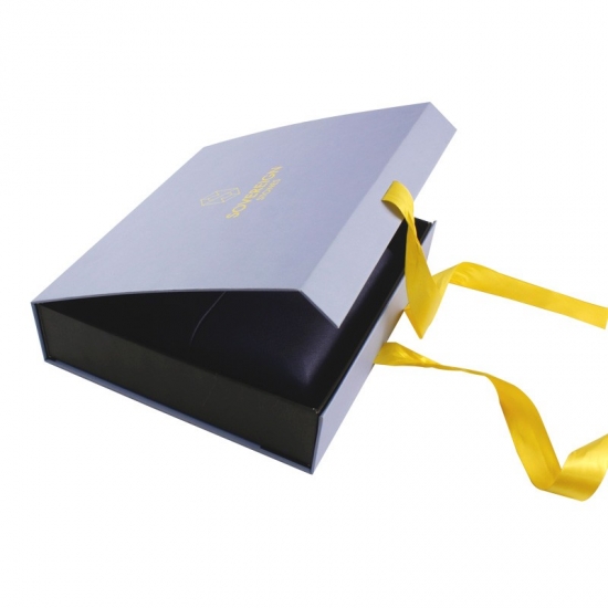Blue magnetic gift boxes with ribbon was made by 157gsm C2S art paper laminated with 2mm grey cardboard with EVA foam and ribbon ,support customized any size any color and logo ,surface finishing was matt lamination hot stamping size 25*23*6cm