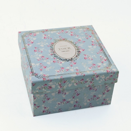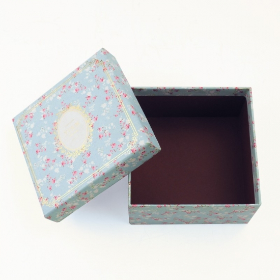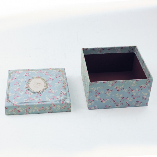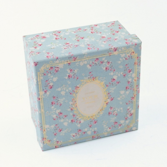 This is custom blue square romantic flower pattern gift lid and base box made by 157g C2S art paper + 1200g grey board,LOGO gold foil hot stamping,inside plain red decorative color.Size:12x12x12 cm.