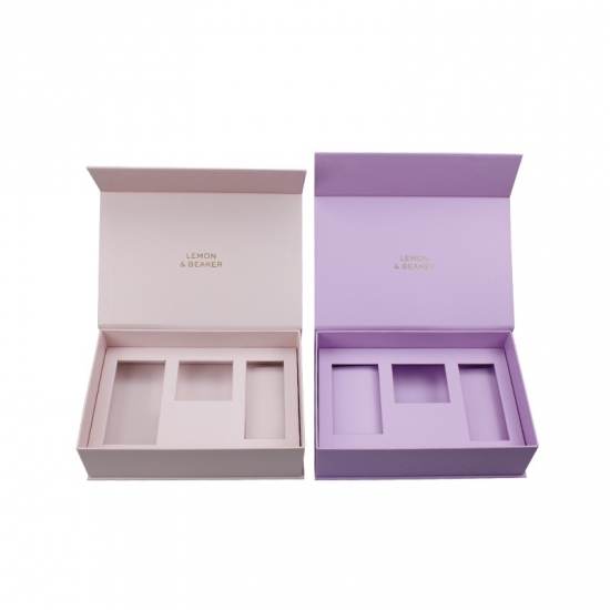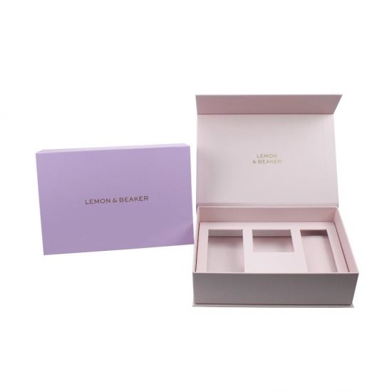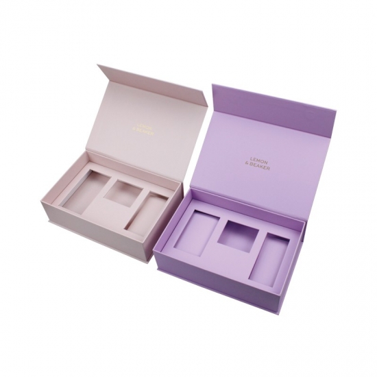 This is clamshell book shaped pink gift box with paperboard insert,made by 157g C2S art paper+1200g grey board,matte finishing,LOGO gold foil stamping, insert size and shape can be customizedas per customers' request.