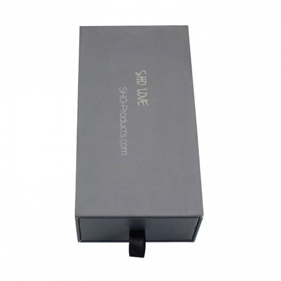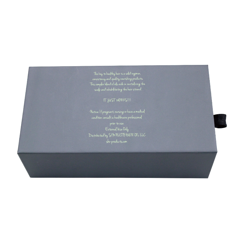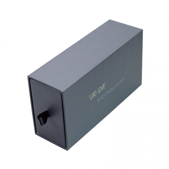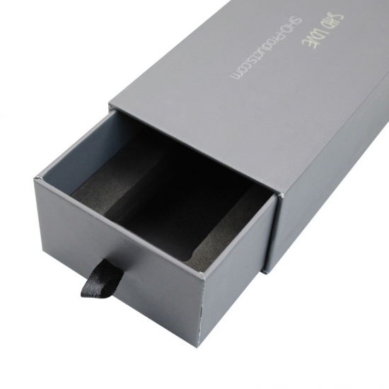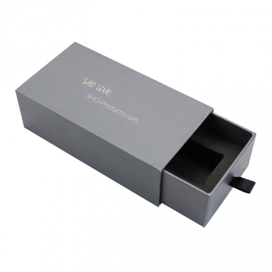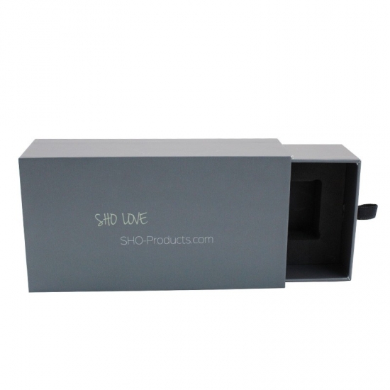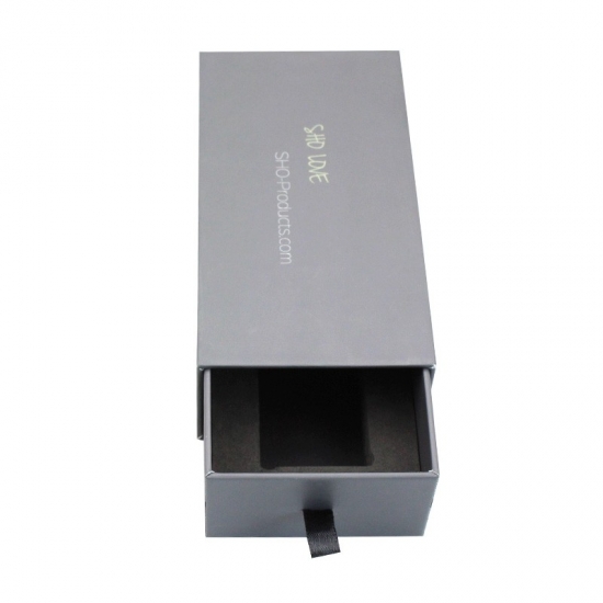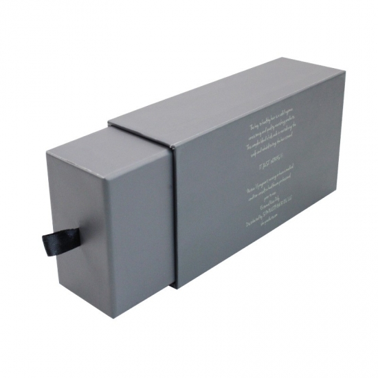It's a pink color custom drawer box packaging which made by C2S art paper + 1200g grey board,full of grey printing on front and back side with logo and text,the inside padding use black EVA in good quality.