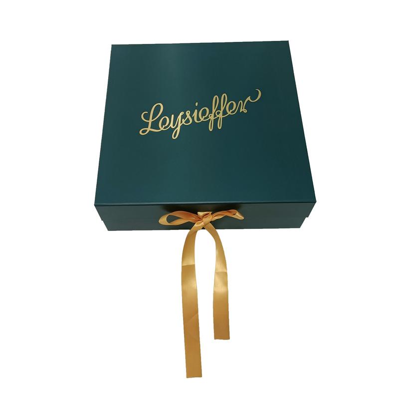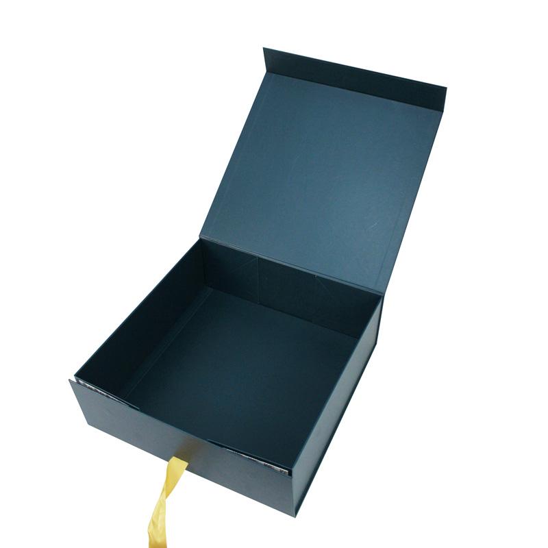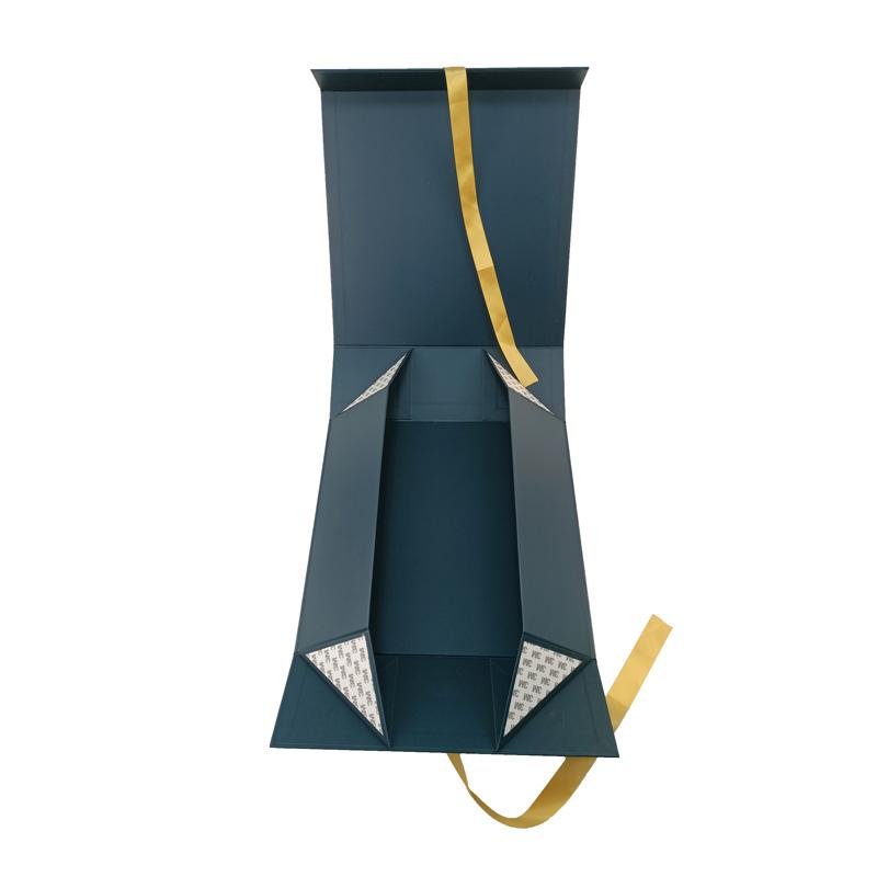 Luxury Magentic Collapsible Paper Box , made of 157 gsm art paper laminated with rigid cardboard, Pantone dark blue color printed all over the boxes with custom logo printed in Pantone Gold. Both magnetic and ribbon inserted for box closure, with 3M adhesive tape on the four corner to keep the box in shape. It is popular used for shoe packaging, and other boutique gift packaging.