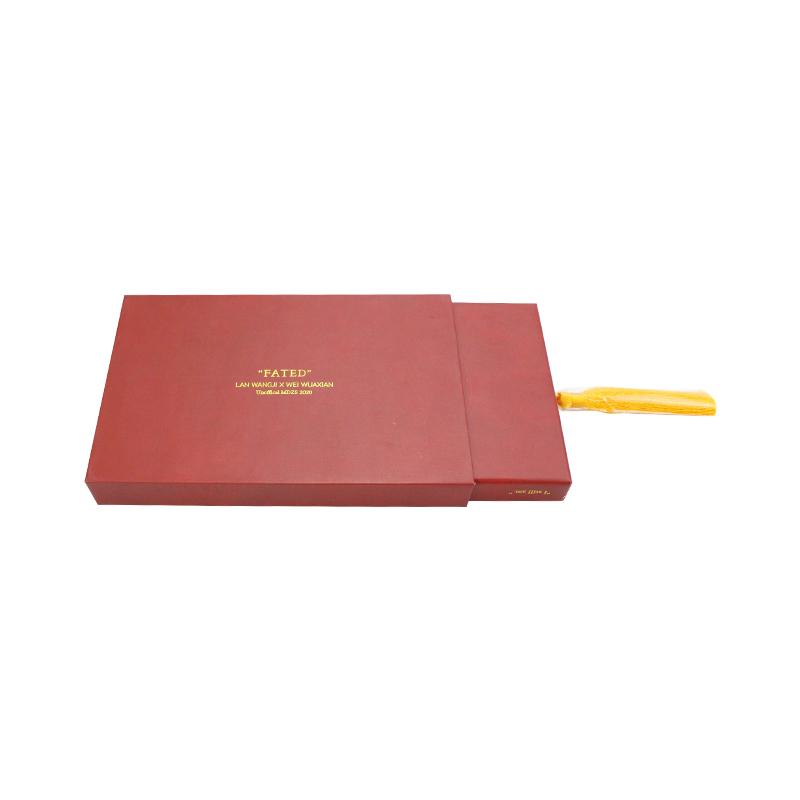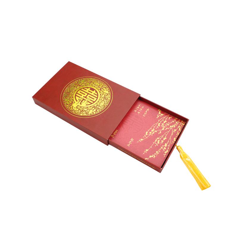 Custom logo high end chinese style festival invitation drawer box ,rectangle shape full printing with spot red color,gold hot stamping logo with golden ribbon,matt laminationsurface finishing.
