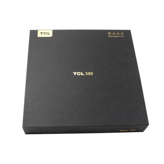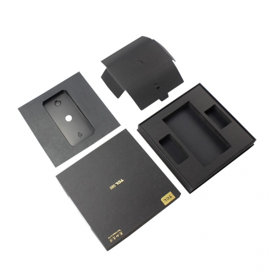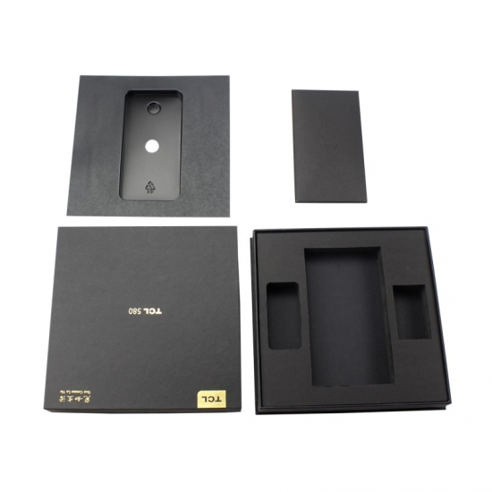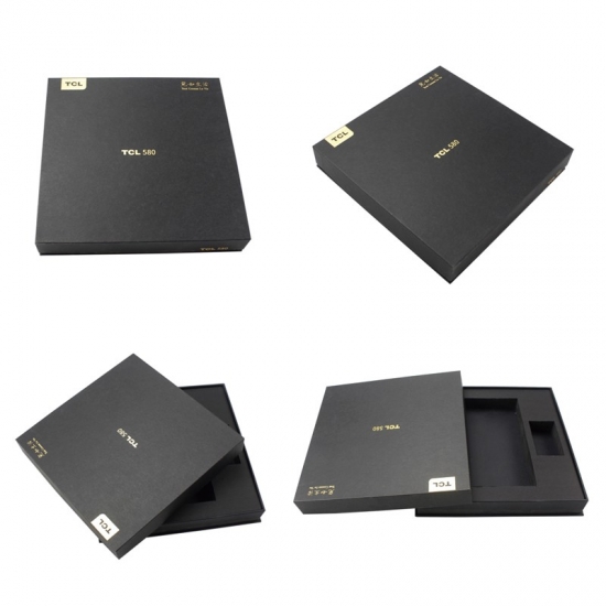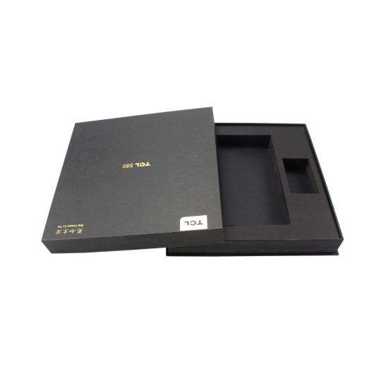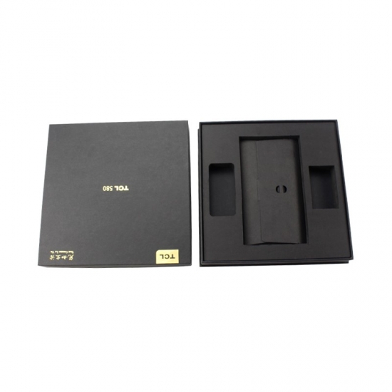 This is a custom large paper cardboard mobile phone gift boxes with lids,mady by black cardboard paper+ 1200g grey board,custom logo gold foil stamping,inside of the box have black strong EVA foam divider insert to hold the phone and seperate with accessories.