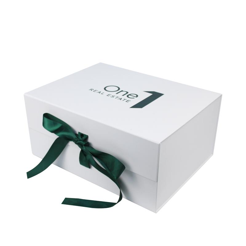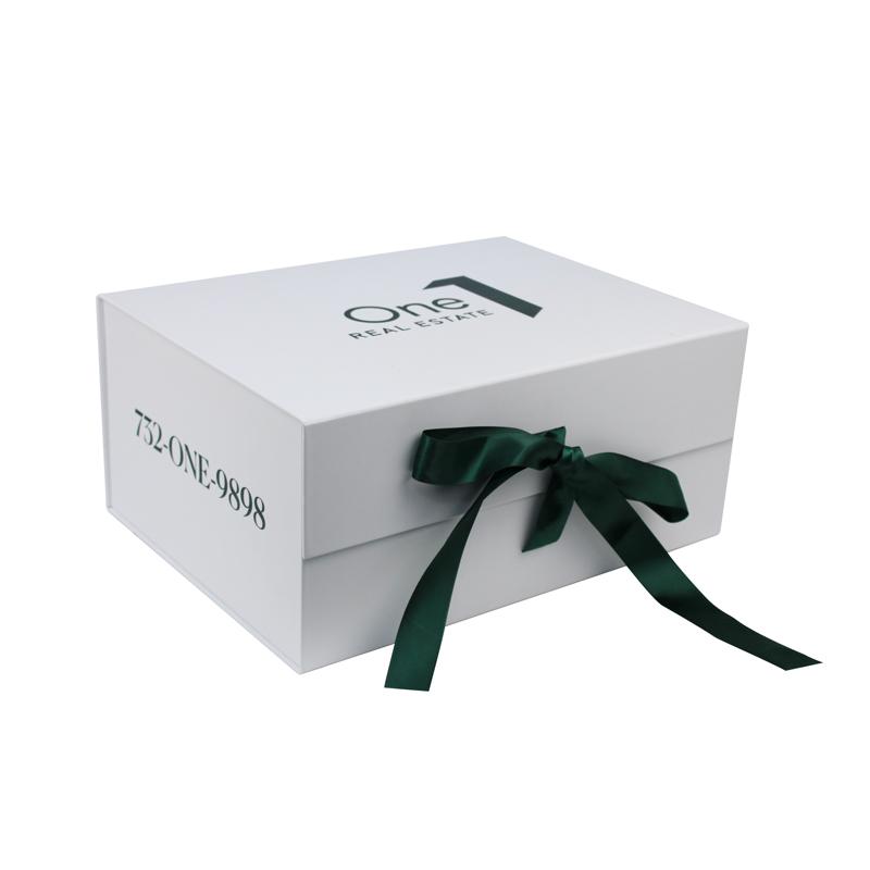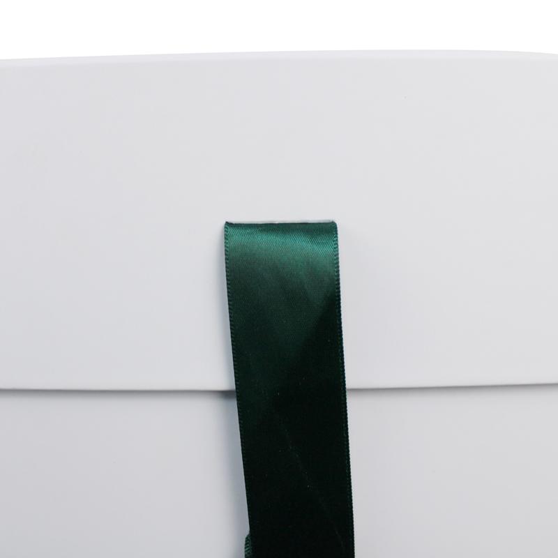 Classical white gift box with Ribbon, made of premium art paper mounted with 1400gsm rigid cardboard , Custom logo printed in Pantone green color, with ribbon in the same Pantone color.