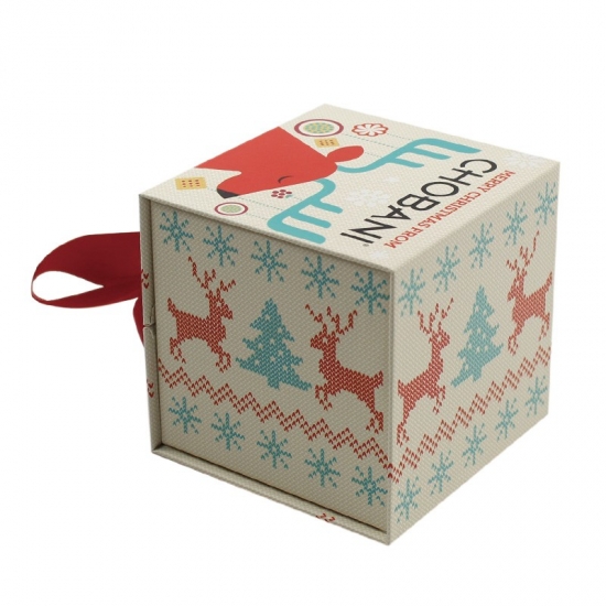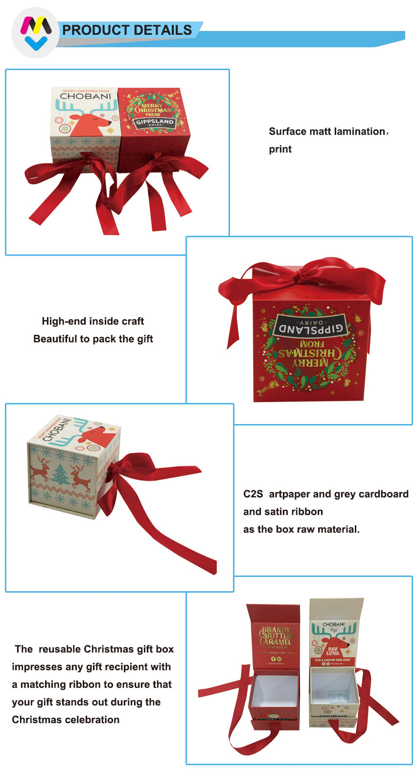 This box is made by 157gsm C2S art paper laminated with 2mm grey cardboard with ribbon . It is a very magnetic lock gift box style, with color printing and matt lamination . It is colorful and fashion out look for Christmas package