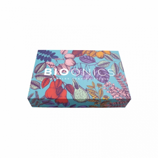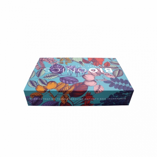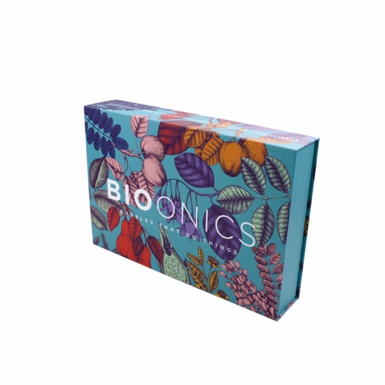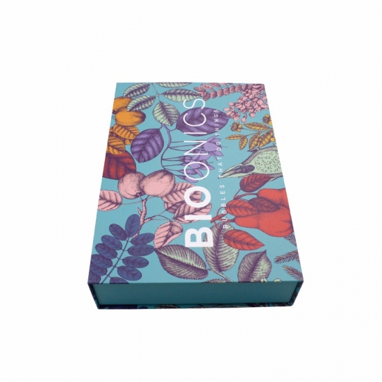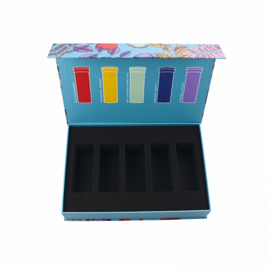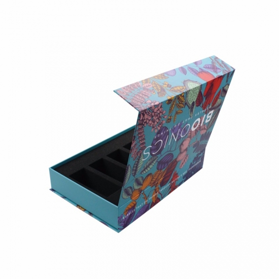 This is a custom gift box with magnetic closure which made by 157g C2S art paper + 1200g grey board ,outside of the box have full colorfull graphic with matte surface finishing,inside of the box bespoke black diecut sponge insert which will hold the products in place.