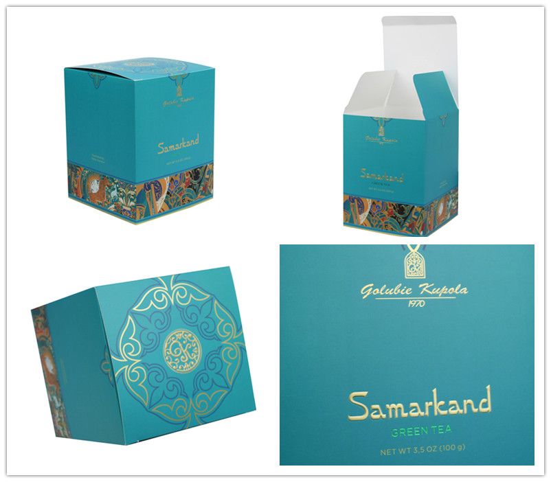 This box is made by 300gsm cardboard with full color design printed. The brand name is well impressed by gold foil embossed and green goil for the tea name. All kind of color foil is available for unique branding information.