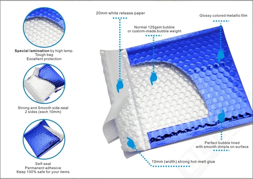 The material of the product: aluminized film + polyethylene bubble. The color of aluminized film can be customized, and the printing content can also be customized