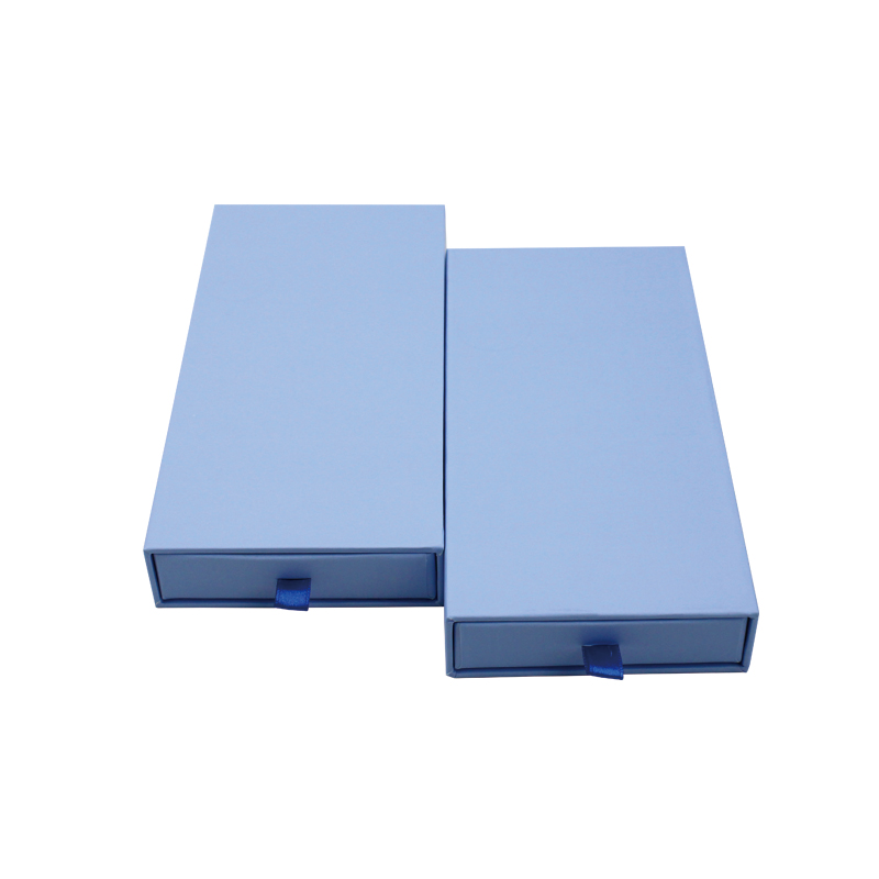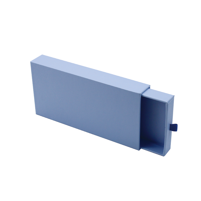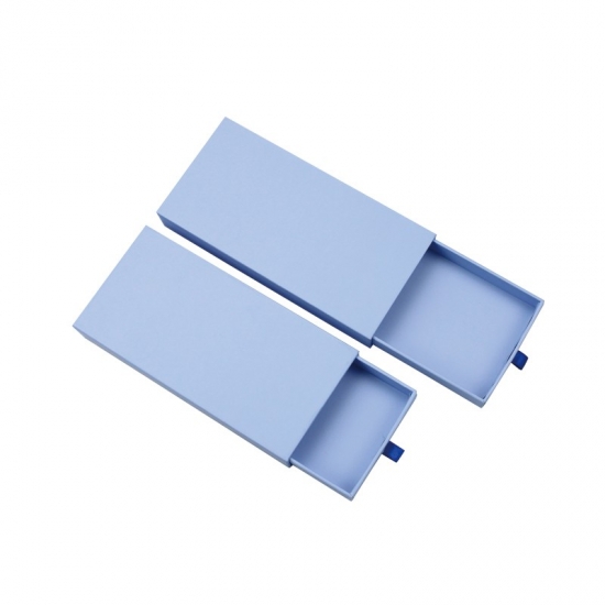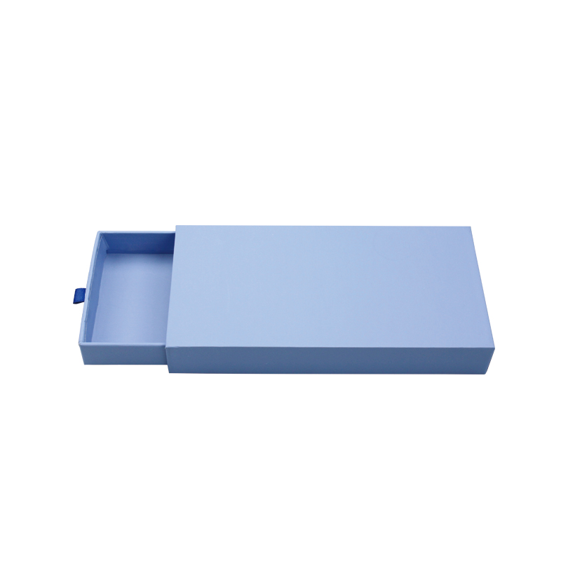 It's a blue sliding drawer box with ribbon puller which made by 157g C2S art paper + 1200g grey board,the whole of the box is full of blue plain one color printing without any patterns.