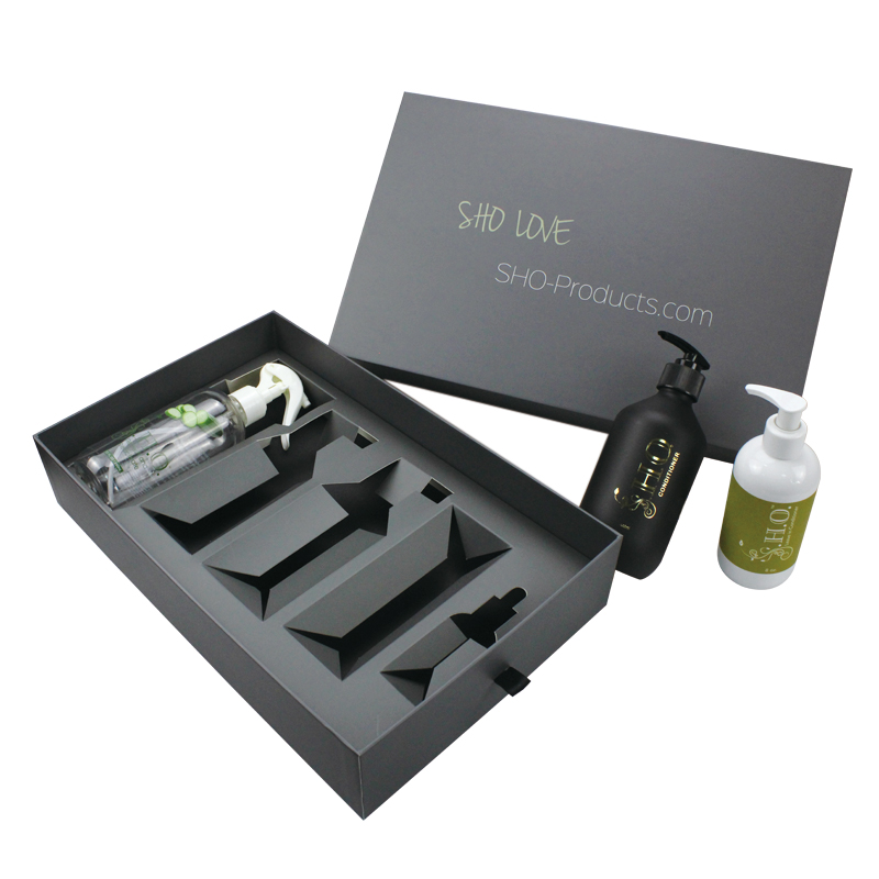It's a sliding gift drawer box with ribbon puller which made by 157g C2S art paper + 1200g grey board,inside the box have dividers use plain gery color cardboard which die cut and molded according to the shape of the product.