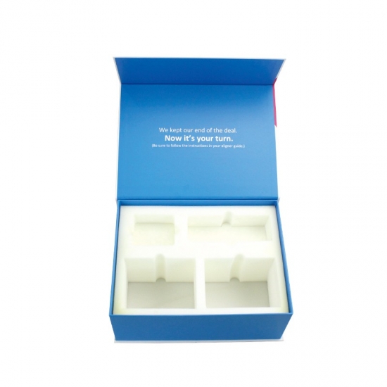 This is a white book shaped magnetic gift boxes made by 157g C2S art paper + 1200g grey board, insert use good and hard white sponge foam which will hold the products which inside the box in place.