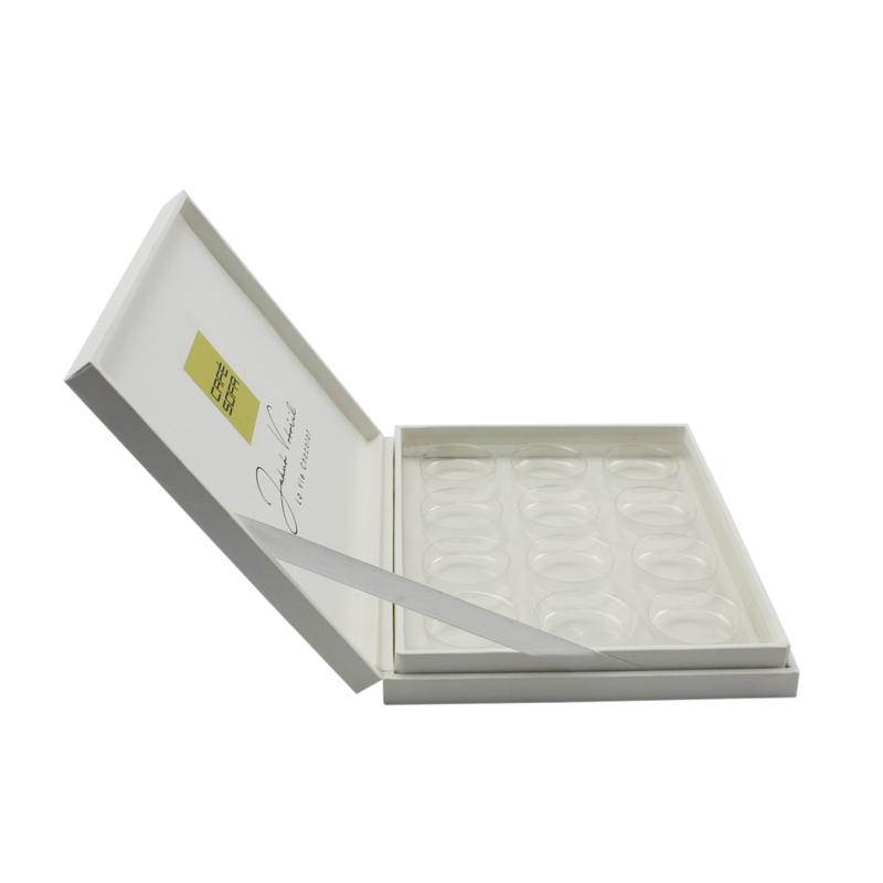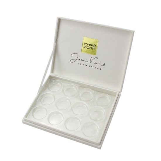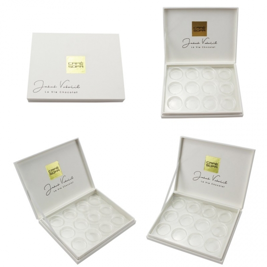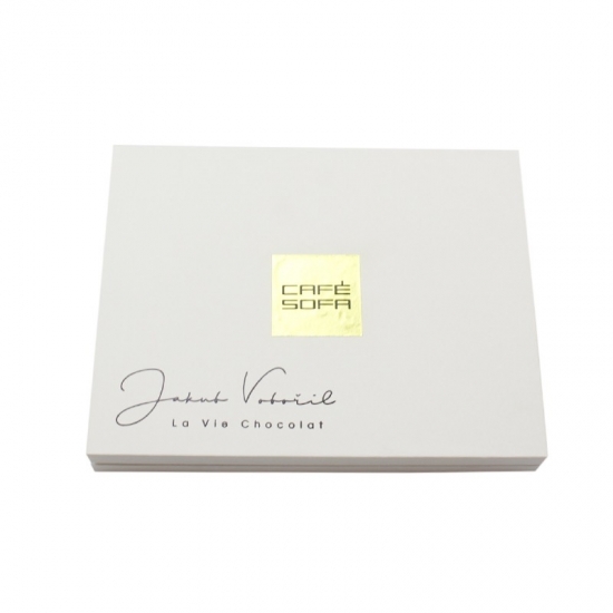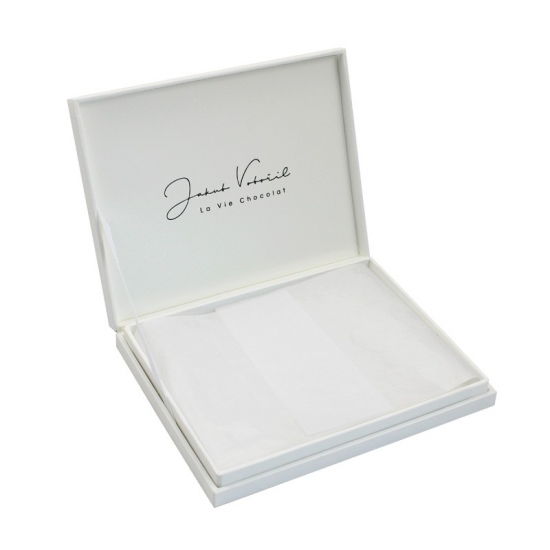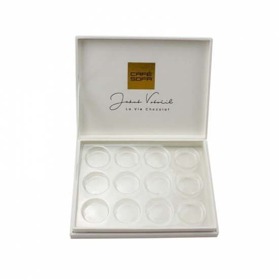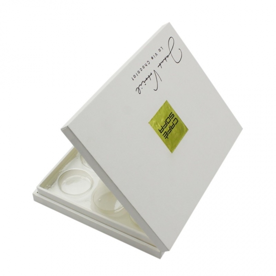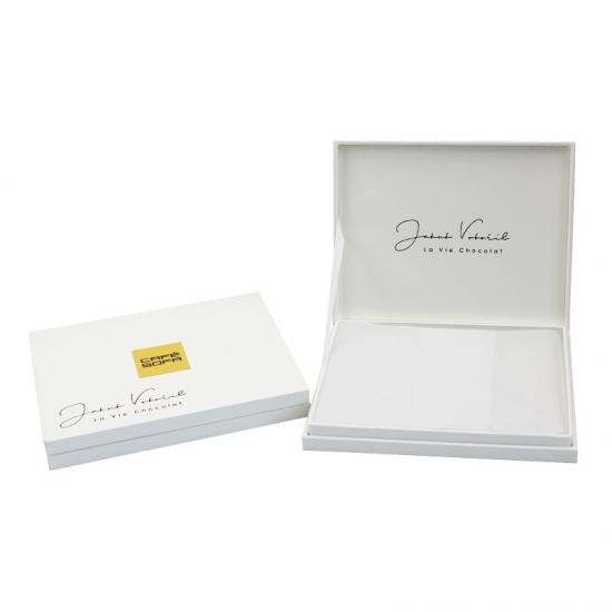 This is a white chocolate packaging box which made by 157g C2S art paper +1200g grey cardboard,outside of box logo in golden foil,the plastic transparent tray inside of the box that can be custom shape as per your request.