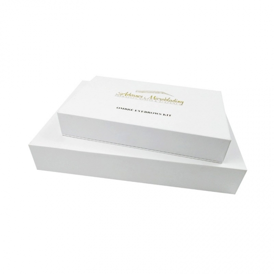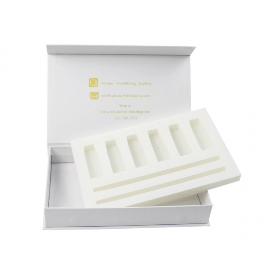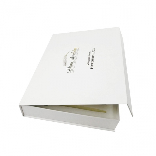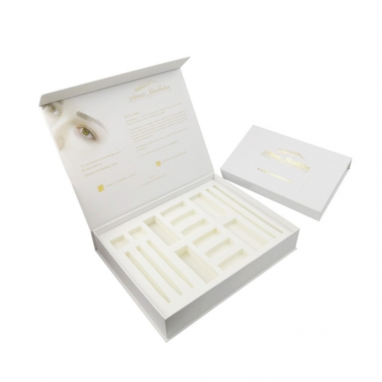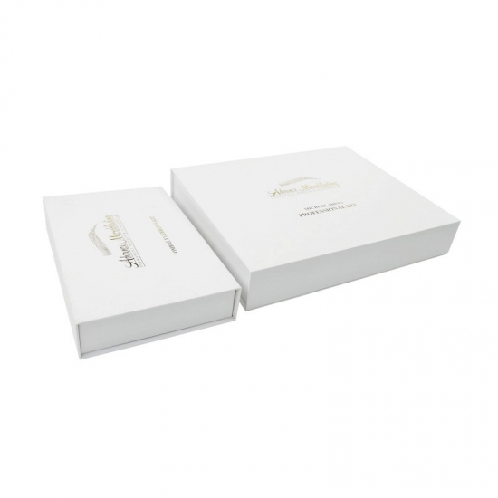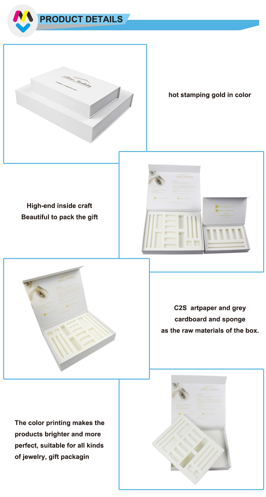 Withe magnetic flip box with hot stamping box was made by 157gsm C2S art paper laminated with 2mm grey cardboard inner is sponge foam customized any size any color and logo ,surface finishing was matt lamination,gold hot stamping size 24*15.5*4 cm