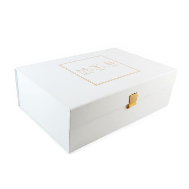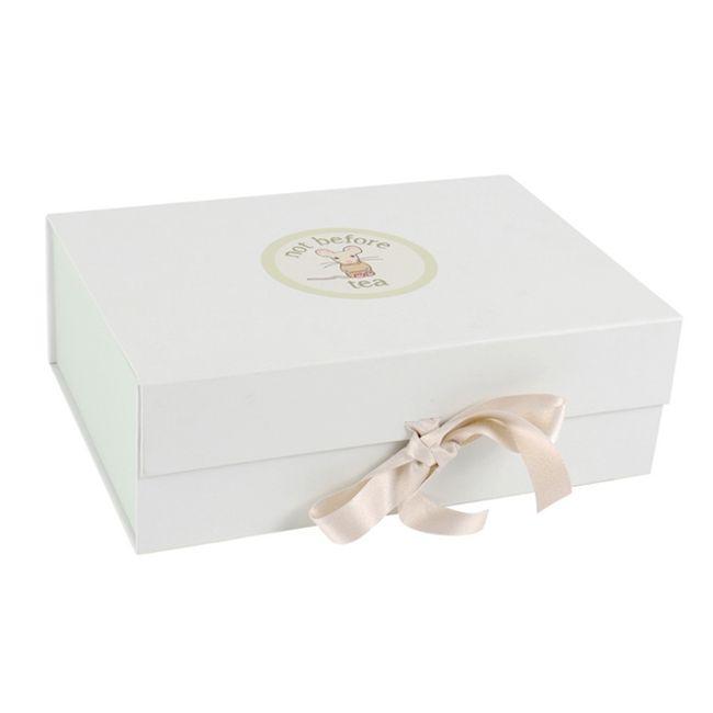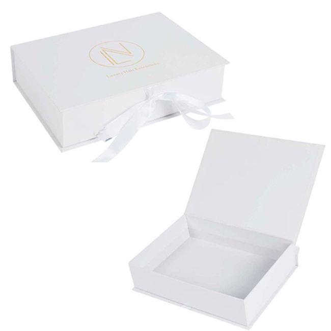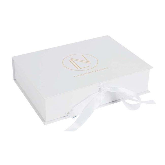 White gift boxes with ribbon which is a foldable gift box,We can customize gift packaging boxes in various colors and sizes, Just tell us your product packaging information