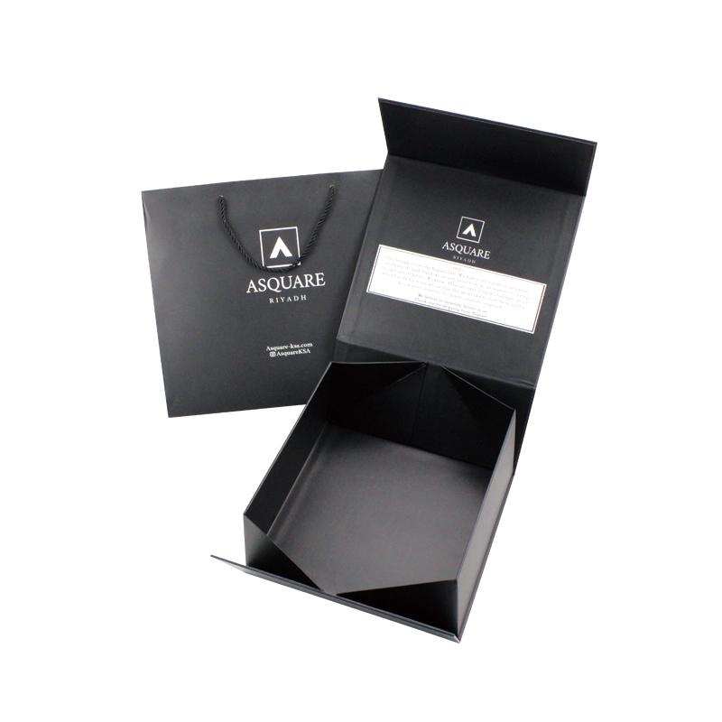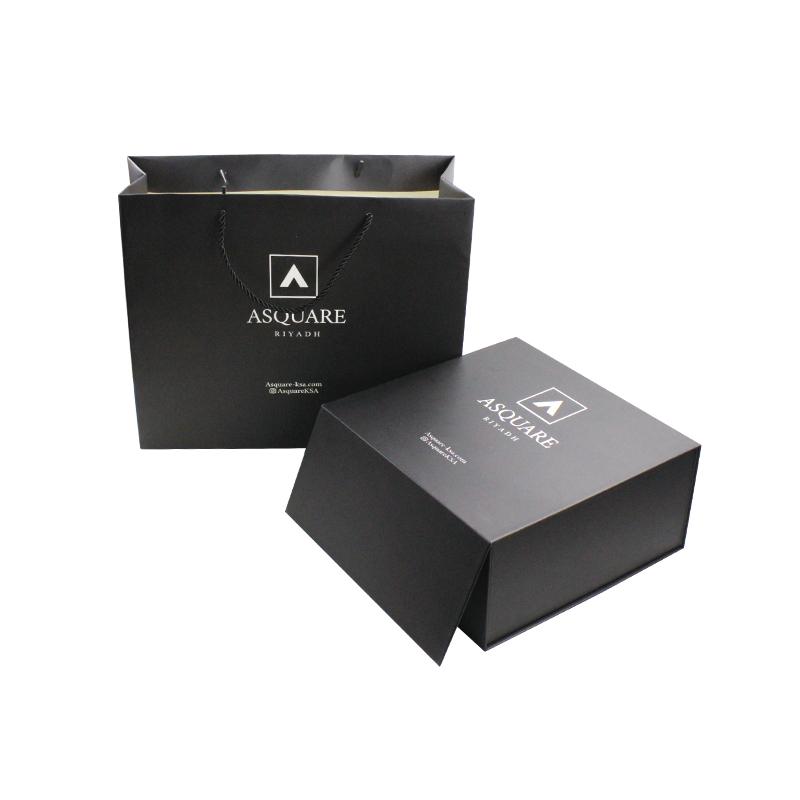 Classic black folding boxes, made of 157 gsm art paper laminated with 2mm premium rigid chipboard. With full black printing and anti-scratch film all over the boxes. As gift packaging, we can also print the paper gift bag to match the gift boxes.
