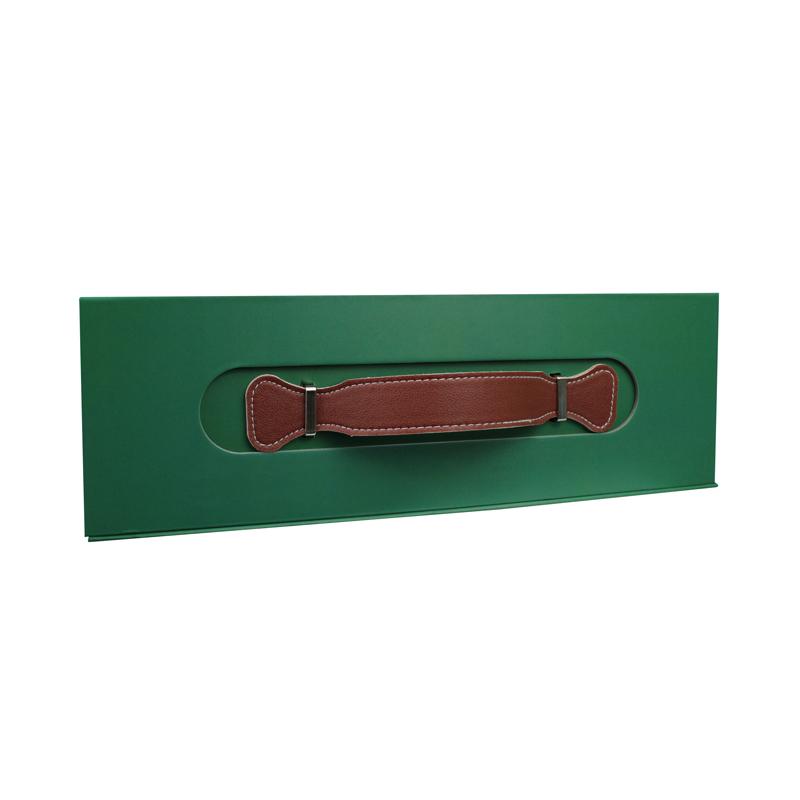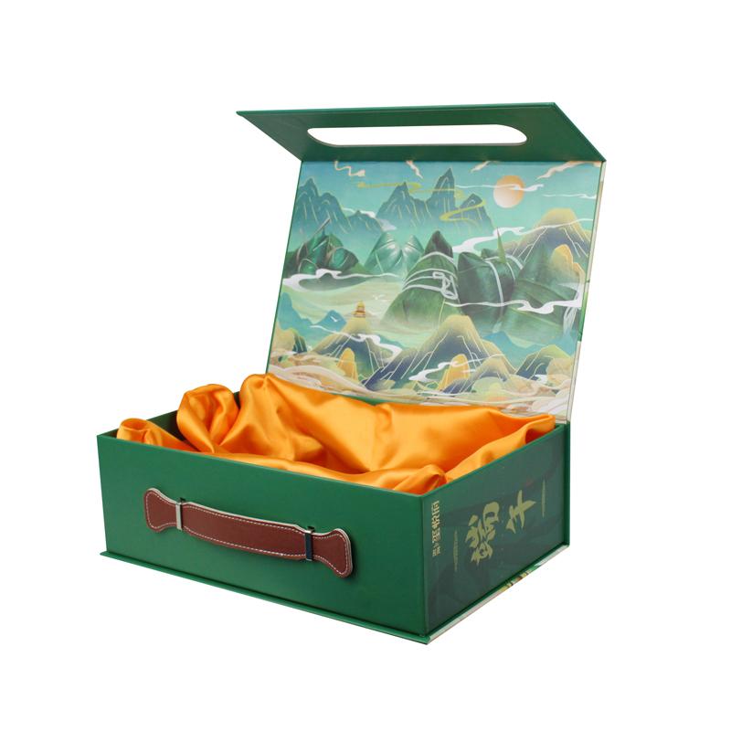 Well-designed paper box with handle, using 157gsm cmyk full color printed art paper mounted with 2mm rigid cardboard. With the leather handle, and soft satin inside, makes your holiday gift well presented to your customer or friend.