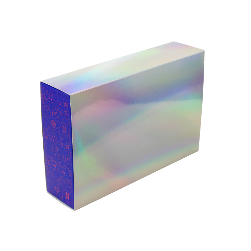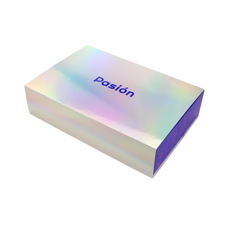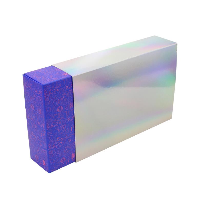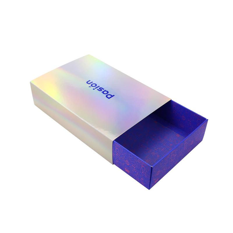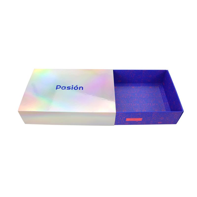 This is a sliding drawer box which made by laser special paper+350g C1S art paper,full of custom matte pattern printing on bottom box,logo in foil on the cover laser paper .