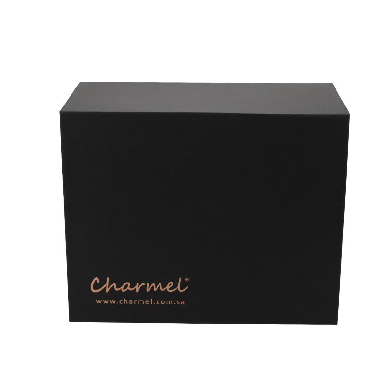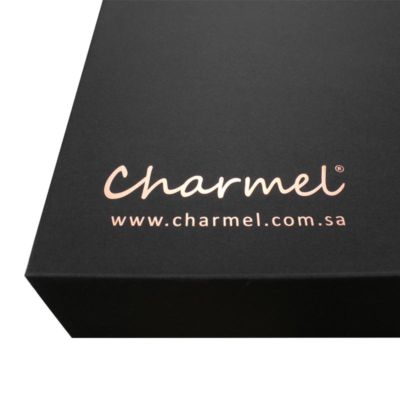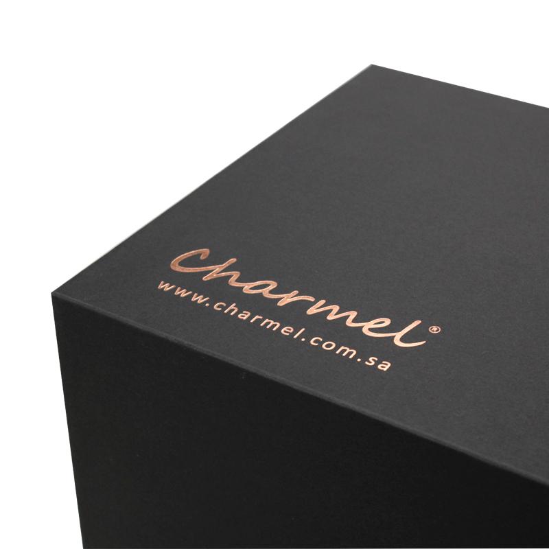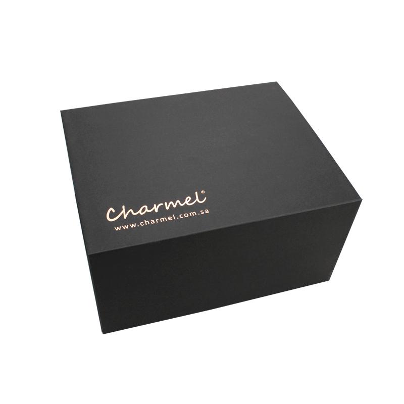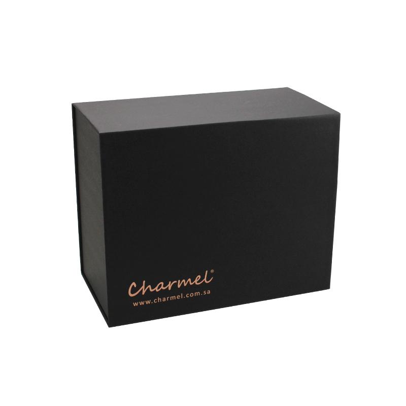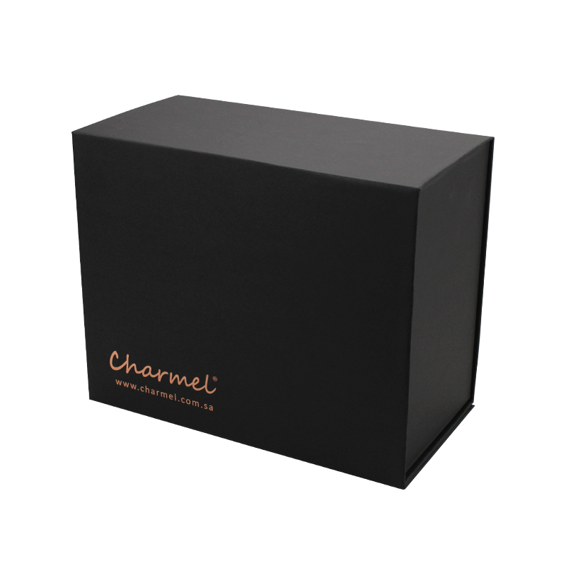 This is a black foldable magnetic packaging boxes which made by specialty black paper + 1200g grey board,the logo on the corner of top lid is rose gold foil stamping.We could custom size and logo as per your request.