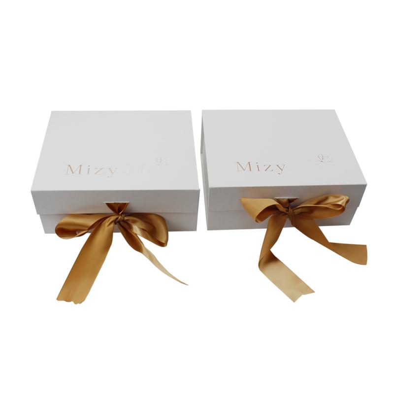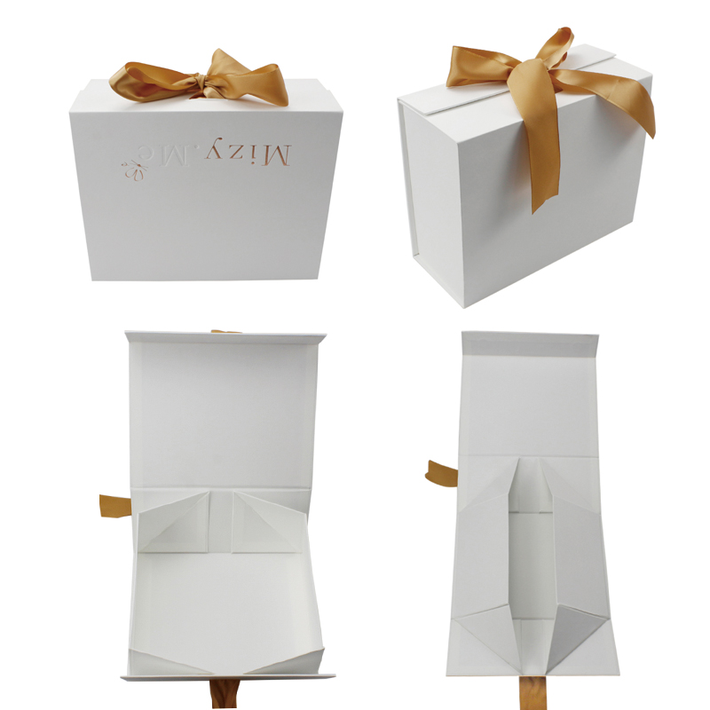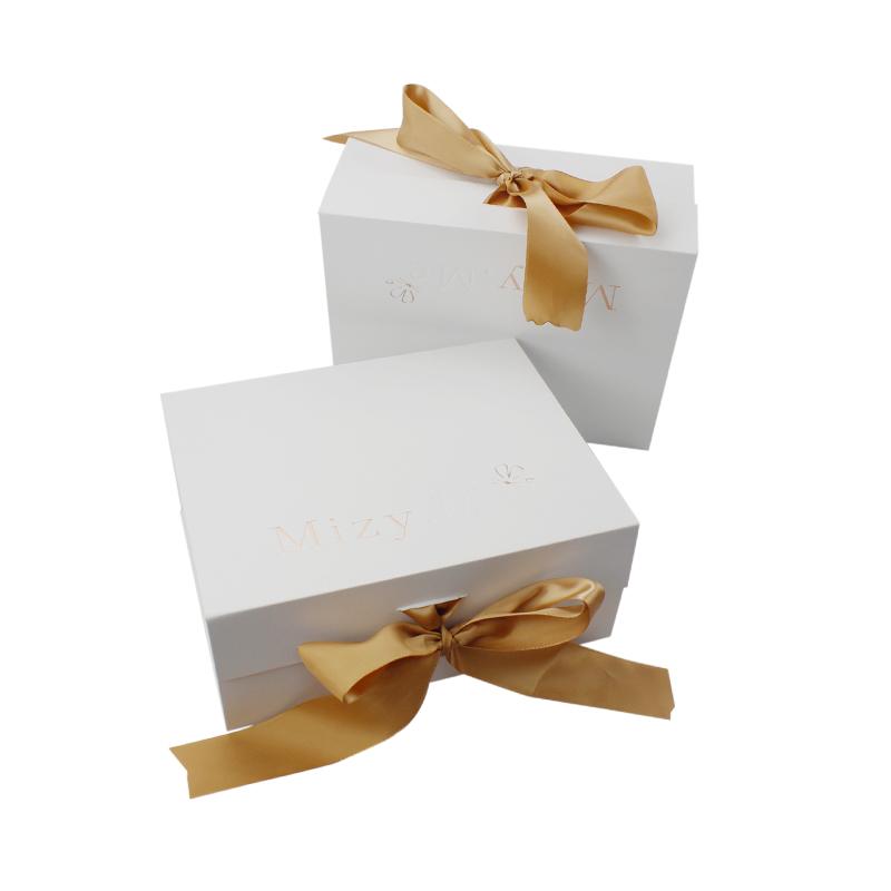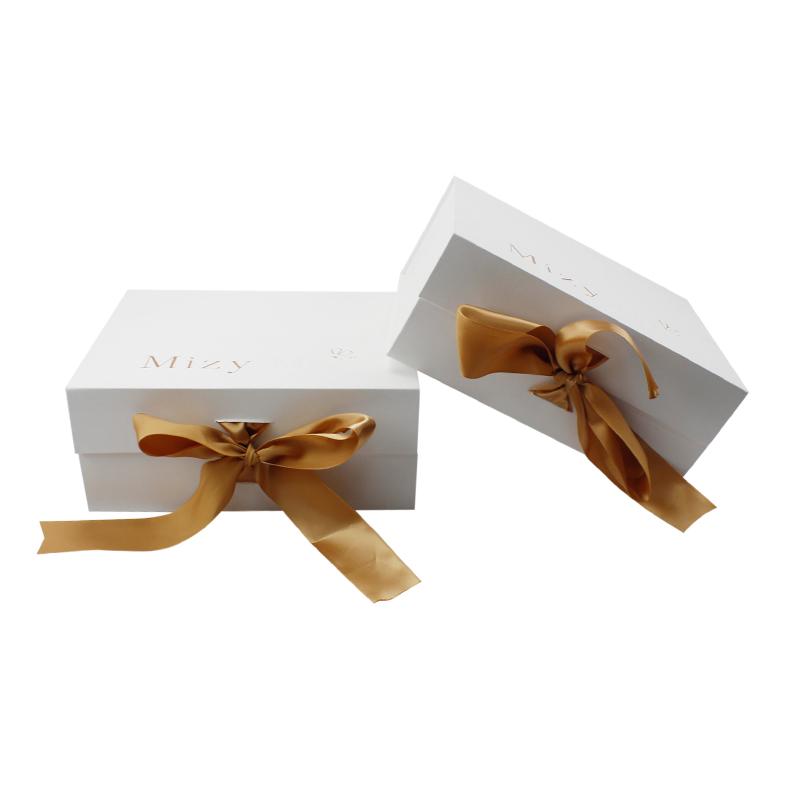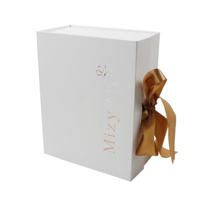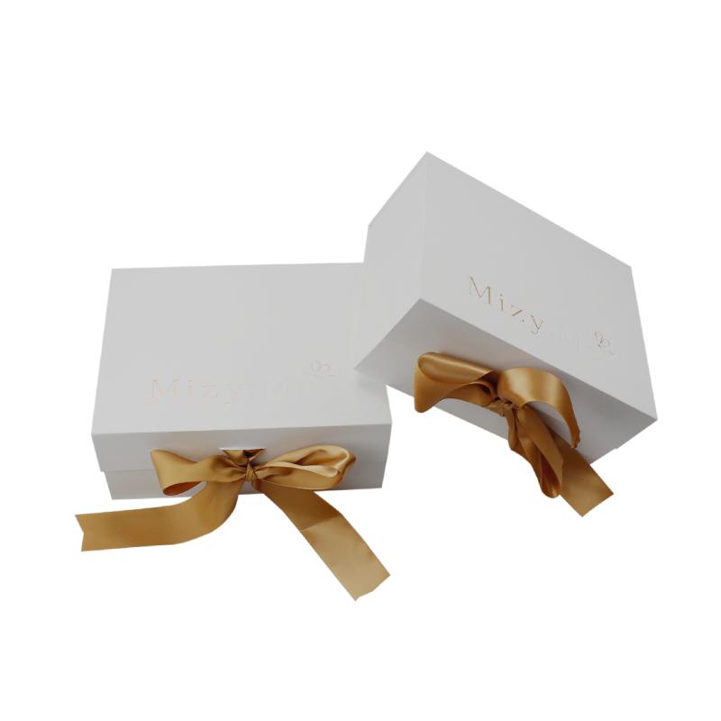 This is a white magnetic gift boxes which made by specialty paper + 1200g grey board,logo gold foil stamped + debossed on outside of box and the attached ribbon clousure match the logo color,plain white without printing inside of box.We could custom size as per your request.