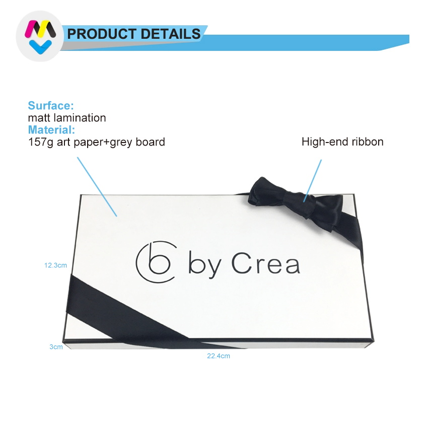 It's a custom high-end and romantic mini black ribbon bowknot decorative short gift lid and base boxes made by C2S art paper + 1000g grey board,use printing logo make the box simple and elegant.