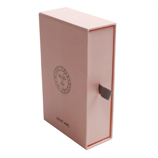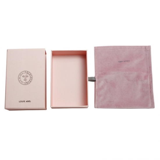 This is a pink jewelry,earring sliding box with drawers which made by specialty texture paper + 1200g grey board ,the drawer inside with soft touch velvet pouch.