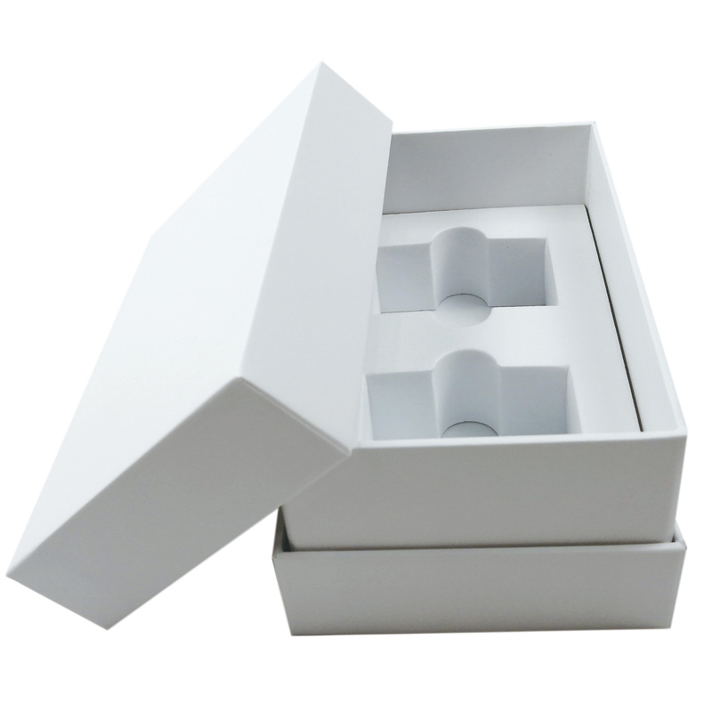 This is a white lidded cardboard box which made by 157g C2S art paper + 1200g grey board, the base with cuff, inside of box have custom shaped white EVA padding insert.