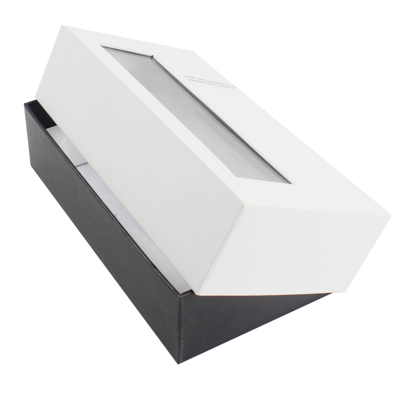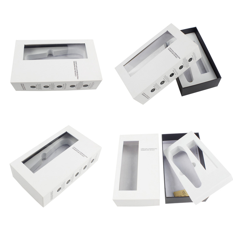 This is a Lid and base box which made by 157g C2S art paper + 1200g grey board,lid attach transparent PVC window to show the products inside, inside of box have custom shaped white EVA padding insert.