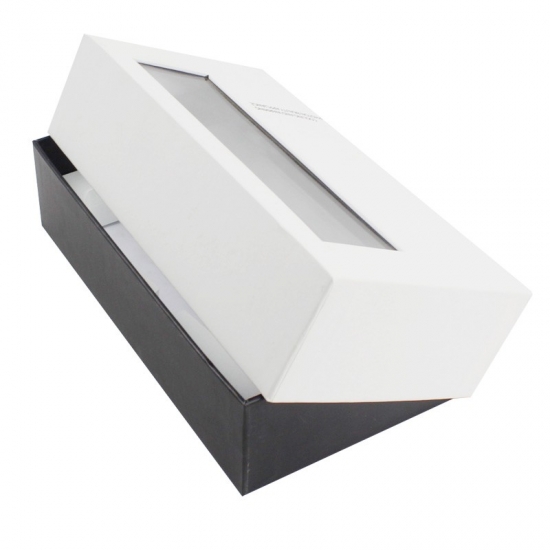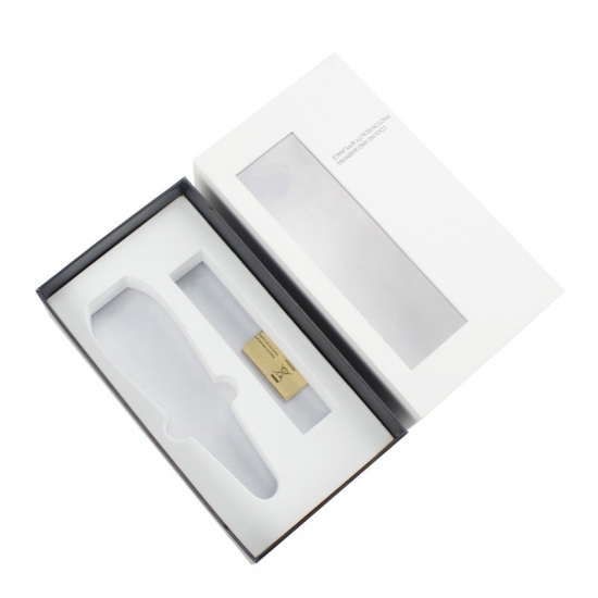 This is a small size cosmetic rectangle box with clear lids which made by 157g C2S art paper + 1200g grey board ,inside EVA padding is shaped accordingly the size of the products will be in the box.