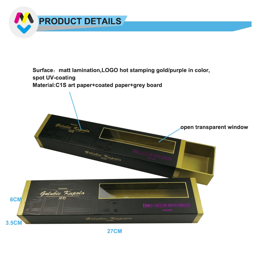 3) Surface Finishing: matt lamination,hot stamping gold/purple in color,spot UV-coating