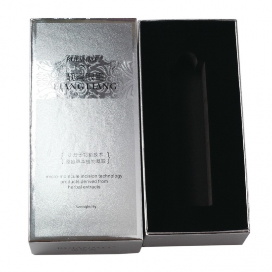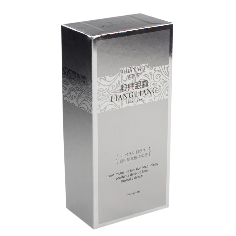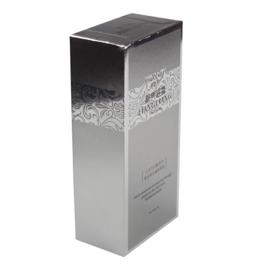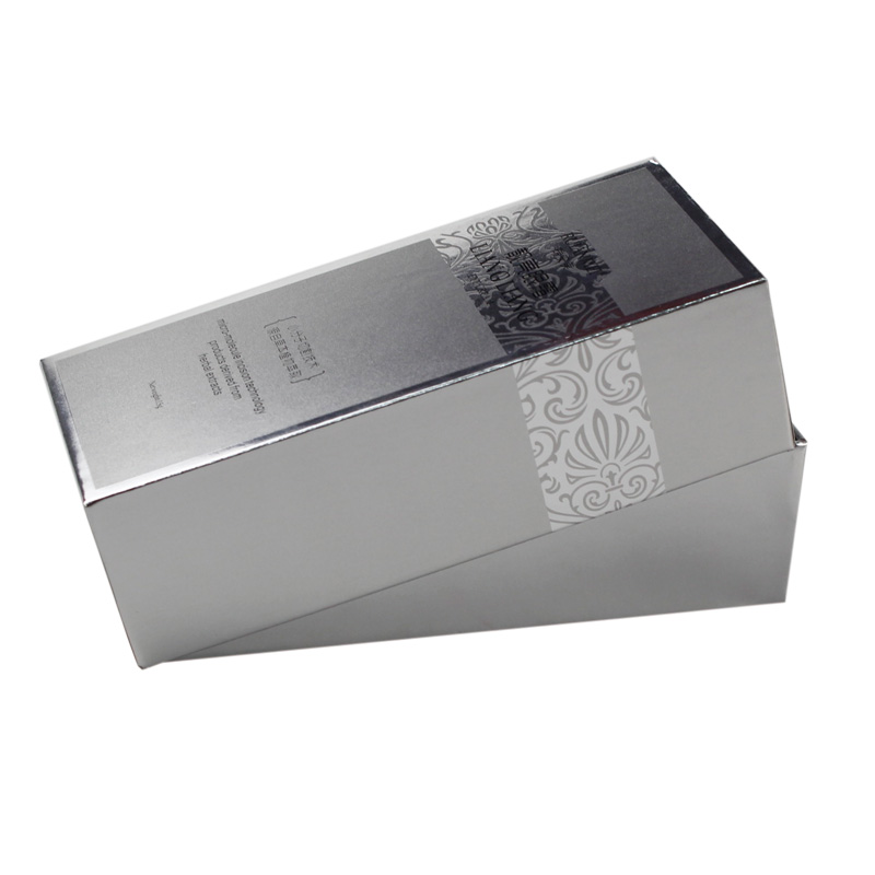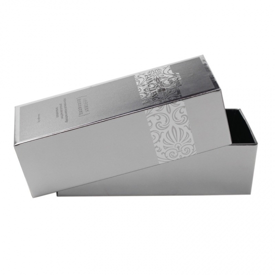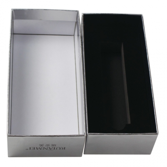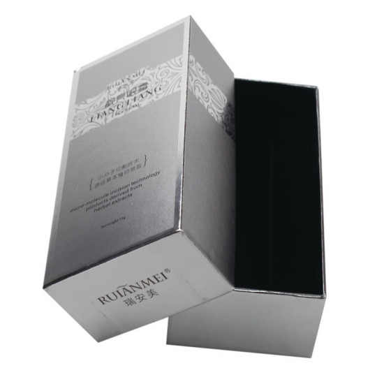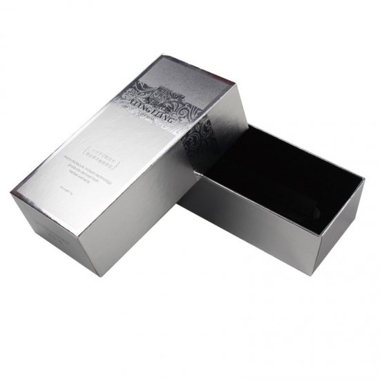 This is a silver colored cosmetic gift rectangle lid and base boxes made by specilaty shiny paper + 1200g grey board, use thesparkling paper make the box super gorgeous high-end .