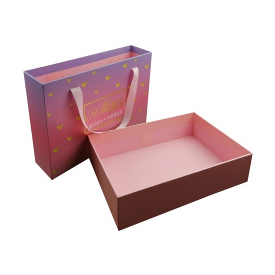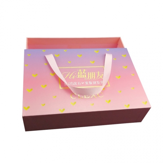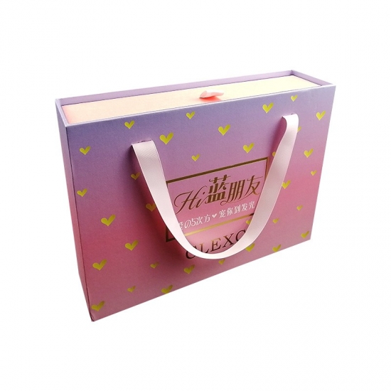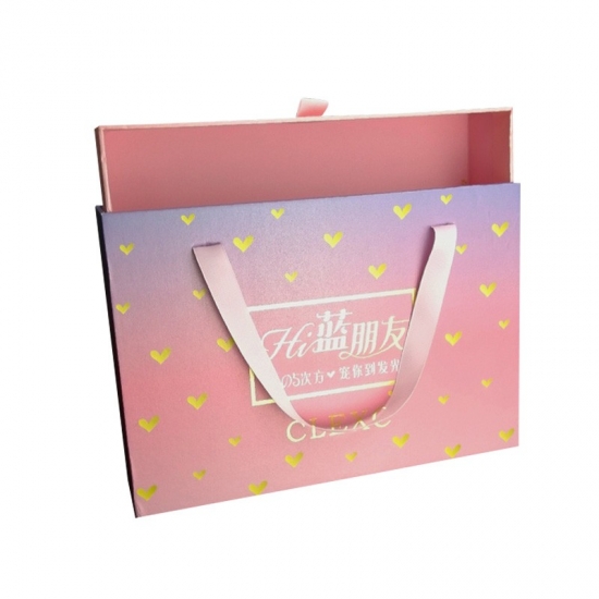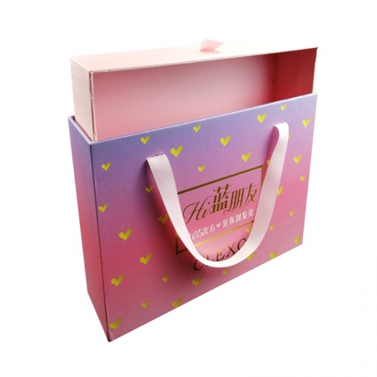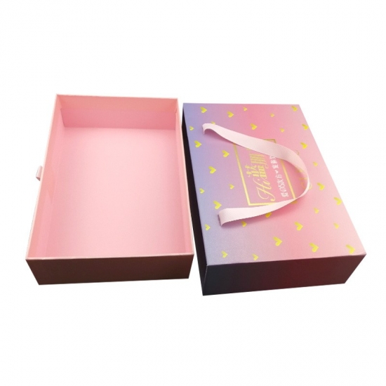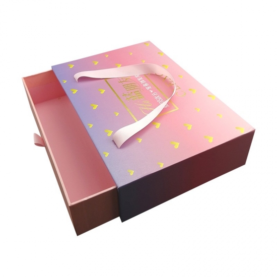 It's a pink large size sliding drawer romantic gift box with ribbon handle which made by 157g C2S art paper + 1200g grey board,outside of box full graphic pattern printing,base box plain pink printing with matte finishing.