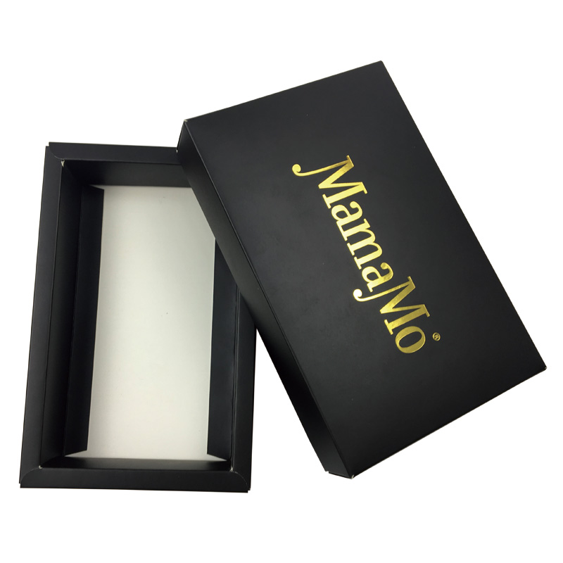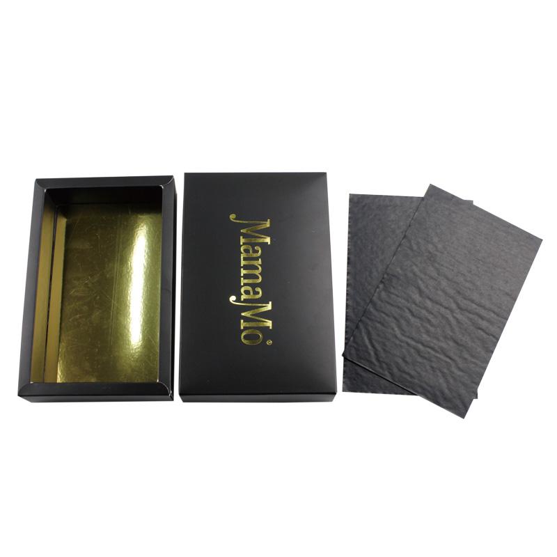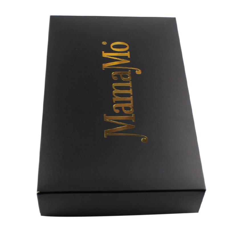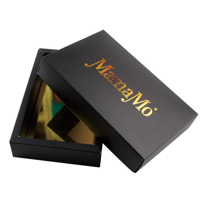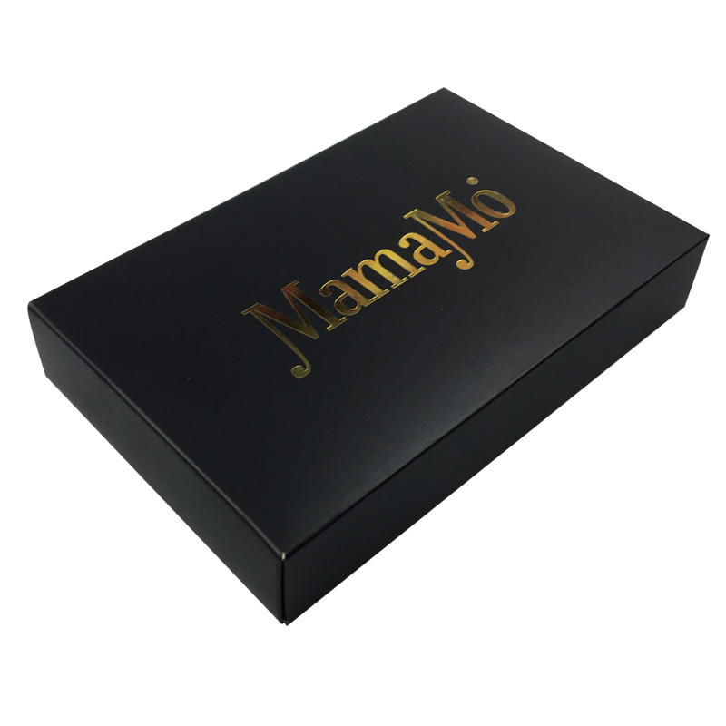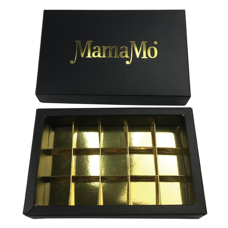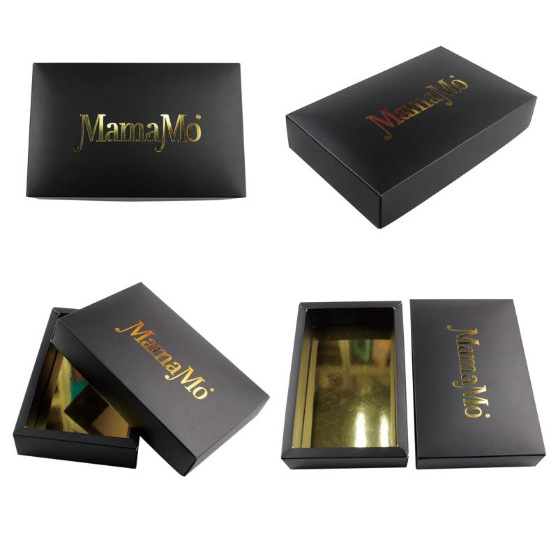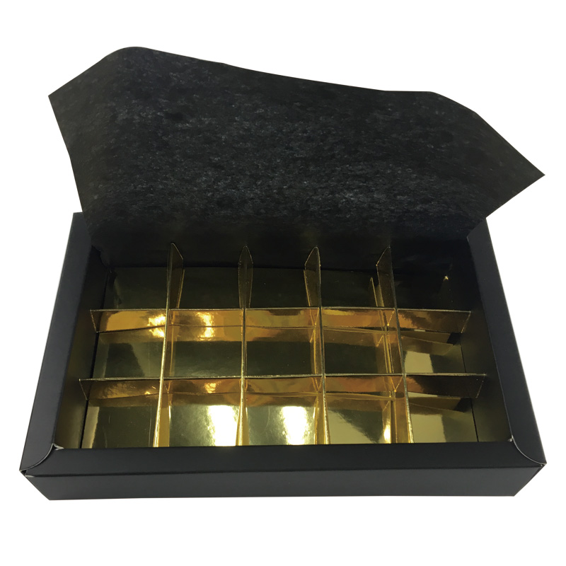 This is a chocolate snack soft card box which made by 350g art paper,full of classic matte black in whole box,the logo on top lid in gold foil stamped and embossed which make the box more high-end and luxury.In the meanwhile, we can match plastic gold divider and wrapping tissue paper for you.
