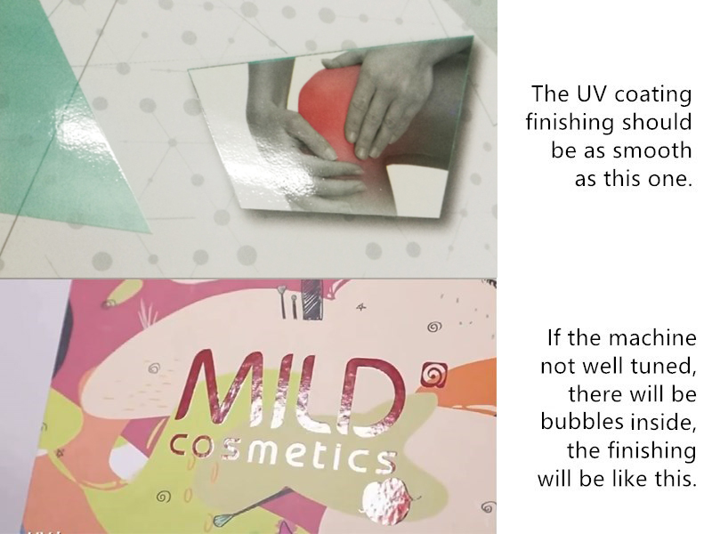 UV finishing is a spot glossy finishing, that can make specific design more bright and reflecting. We can make the box with full UV coating, or spot UV coating. But since the price is also calculated by area, it is better to use spot UV to highlight the logo or some important information. But by different factory with different printer, the UV effect can be quite different as below. For experienced factory, the UV finishing should be smooth glossy, but in some factory, you may get the box with bubbles, as you can see by below image.