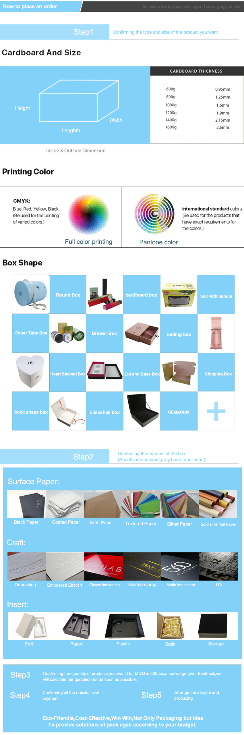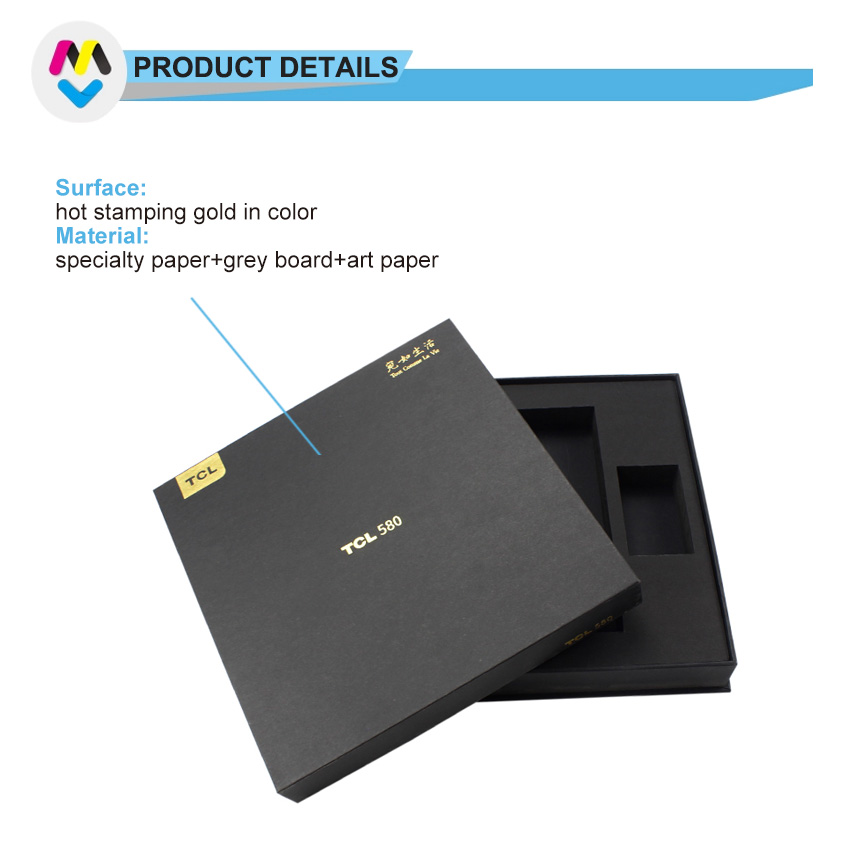 Black paper cardboard, 157g art paper and 2mm grey paper board are the materials of the box. The materials we use is high quality relatively and competitively cheap. So price of the box is not very hard. The golden hop stamping is matching with the black color, really executive.