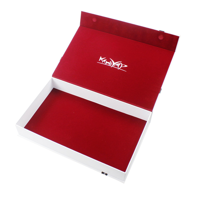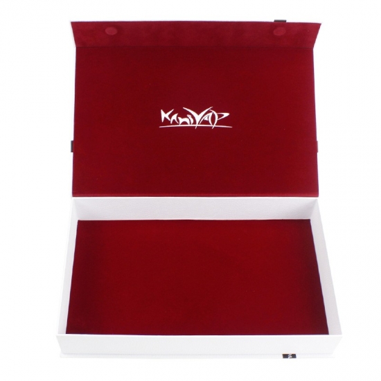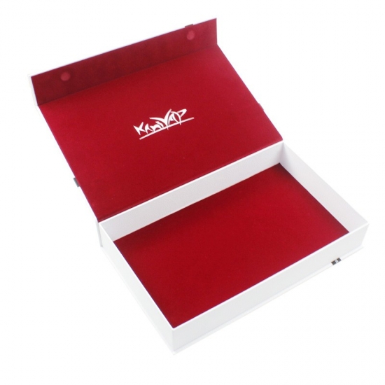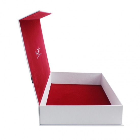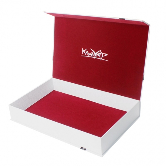 This is a book shaped magnetic gift boxes which madeby white texture specialty paper + 1200g grey board,inside cover with red velvet fabric which improve the boxes more high end.We could custom size as per your request.