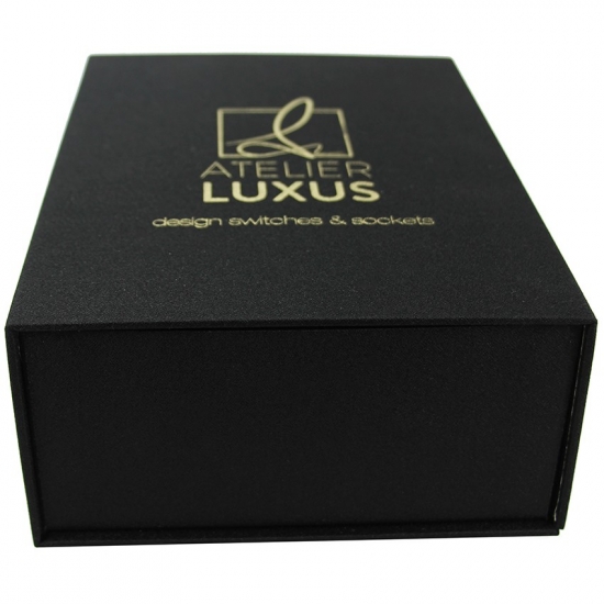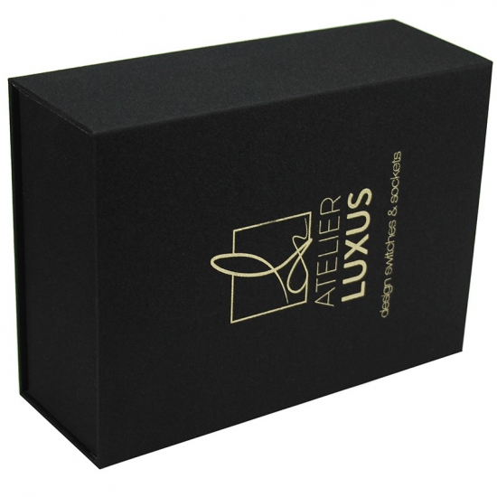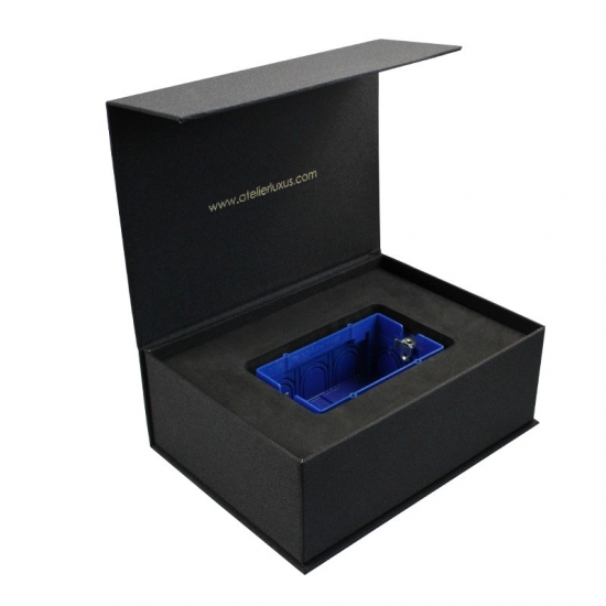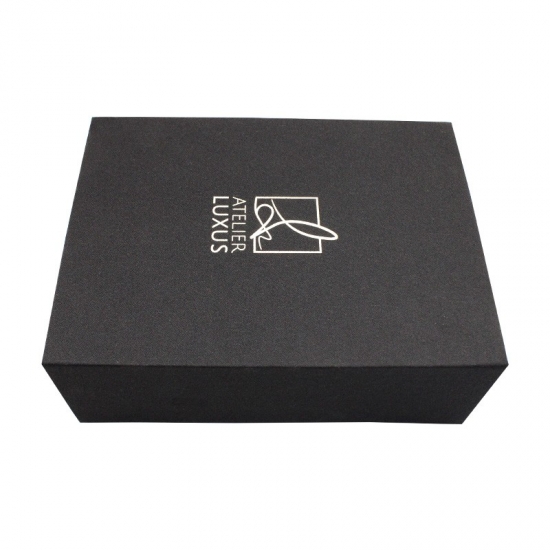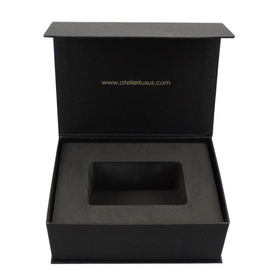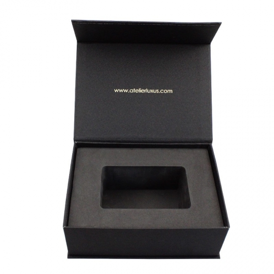 Black flip gift box was made by 157gsm C2S art paper laminated with 2mm grey cardboard with EVA foam support customized any size any color and logo ,Surface finishing was matt lamination hot stamping Size 21*15.5*7.5cm